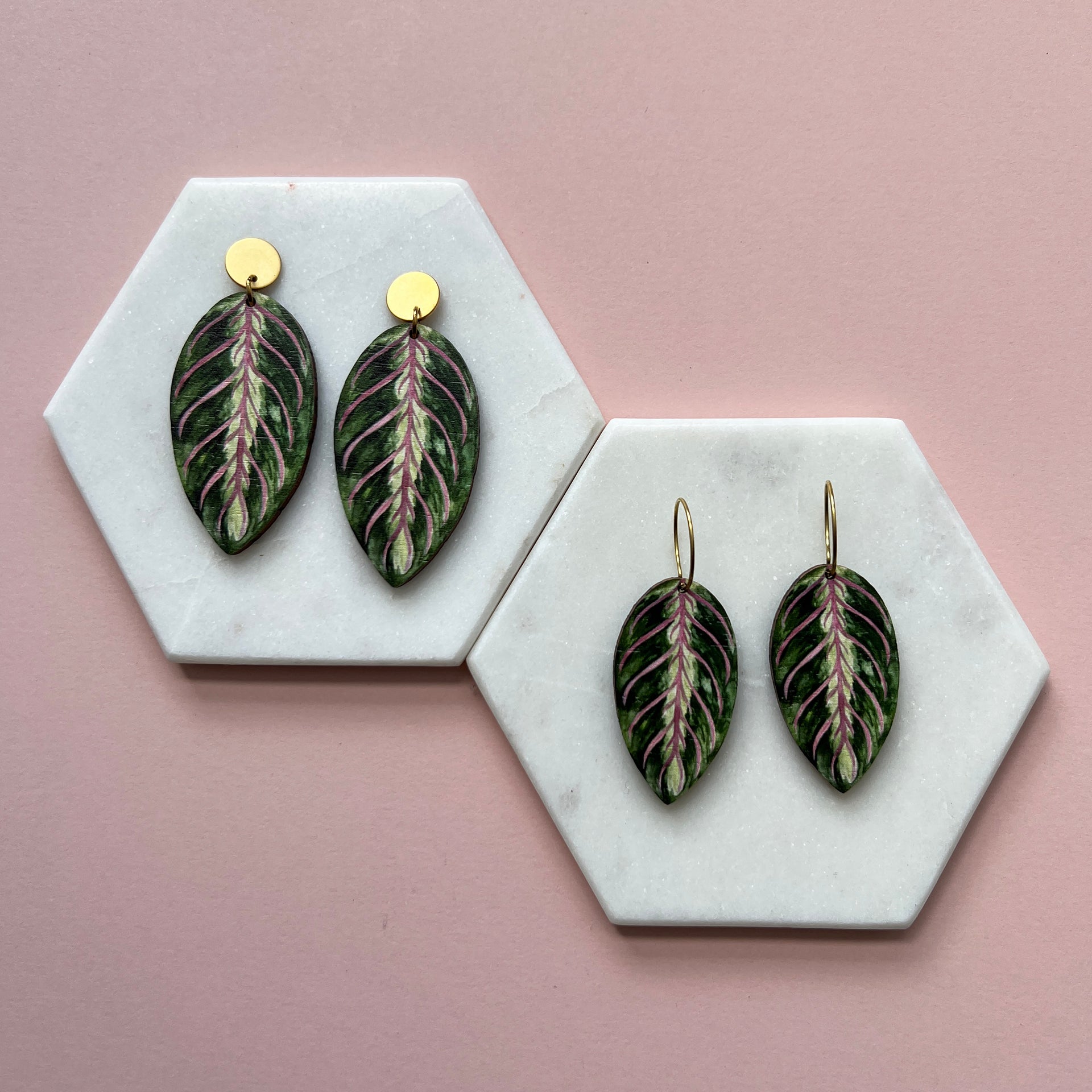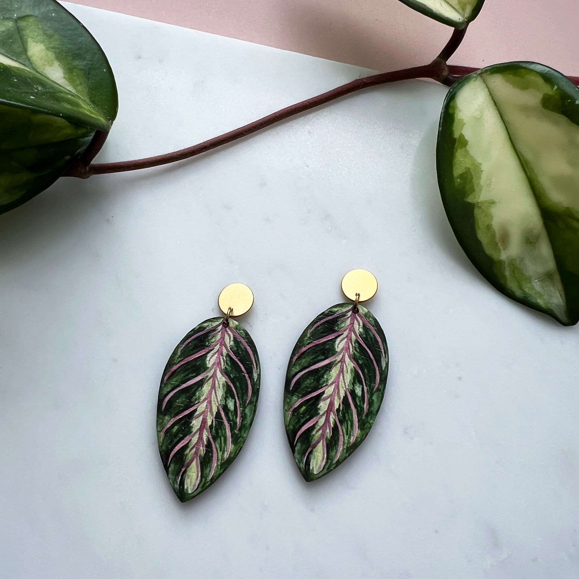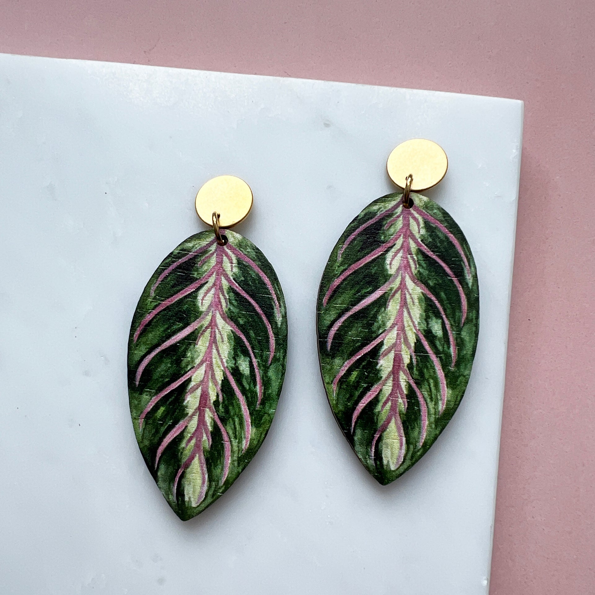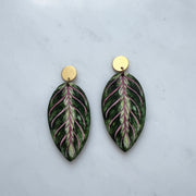 Stunning Maranta leaf drop earrings, inspired by the beautiful leaves of the maranta house plant