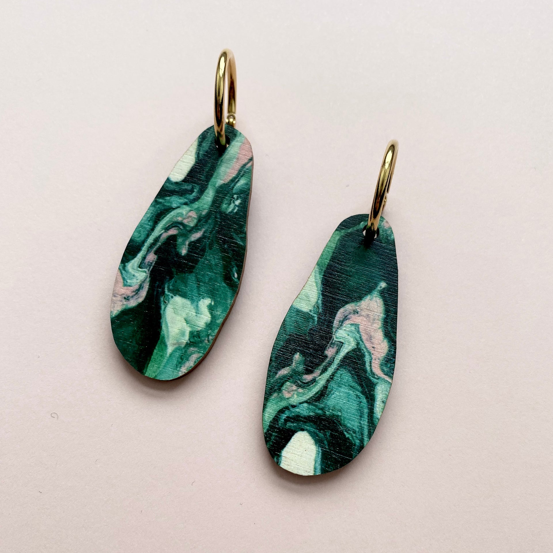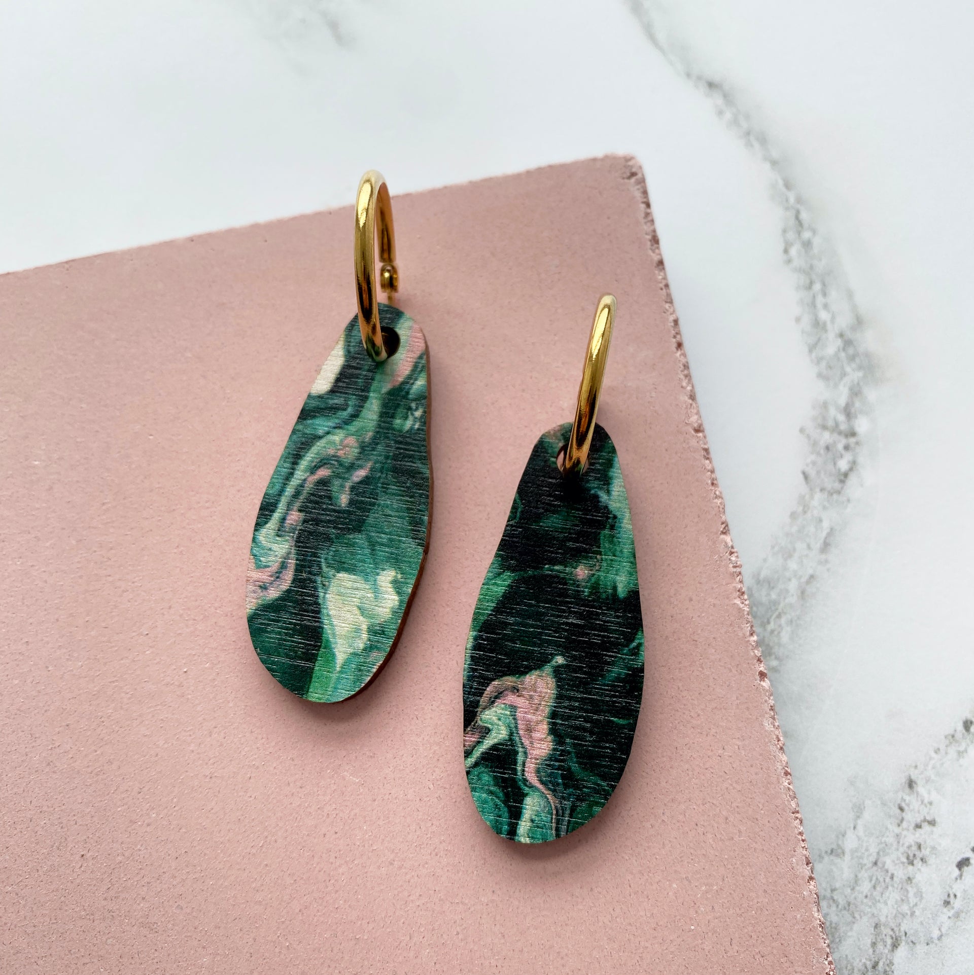 A pretty & unique wooden green & pink marble patterned irregular hoop earrings