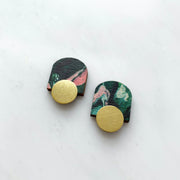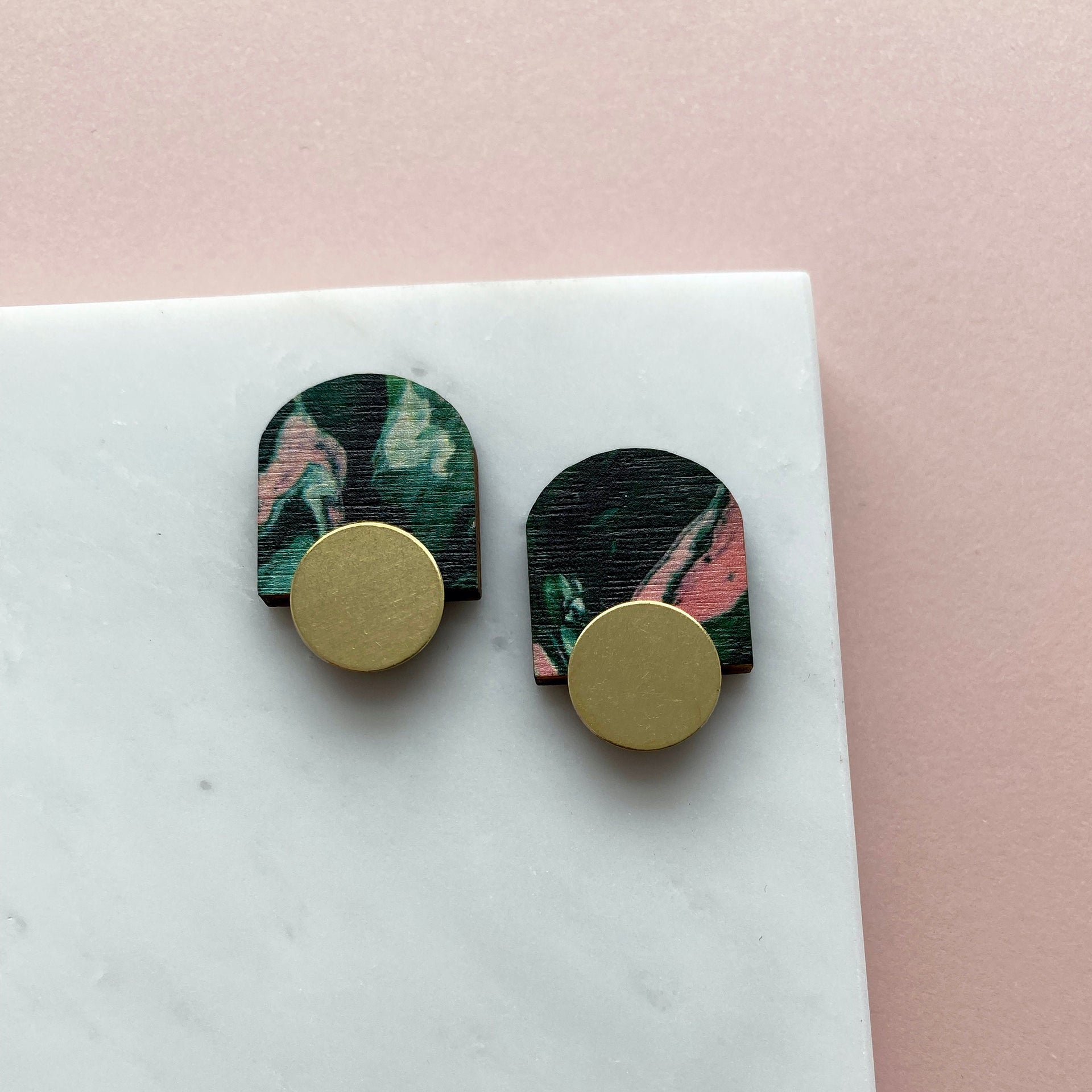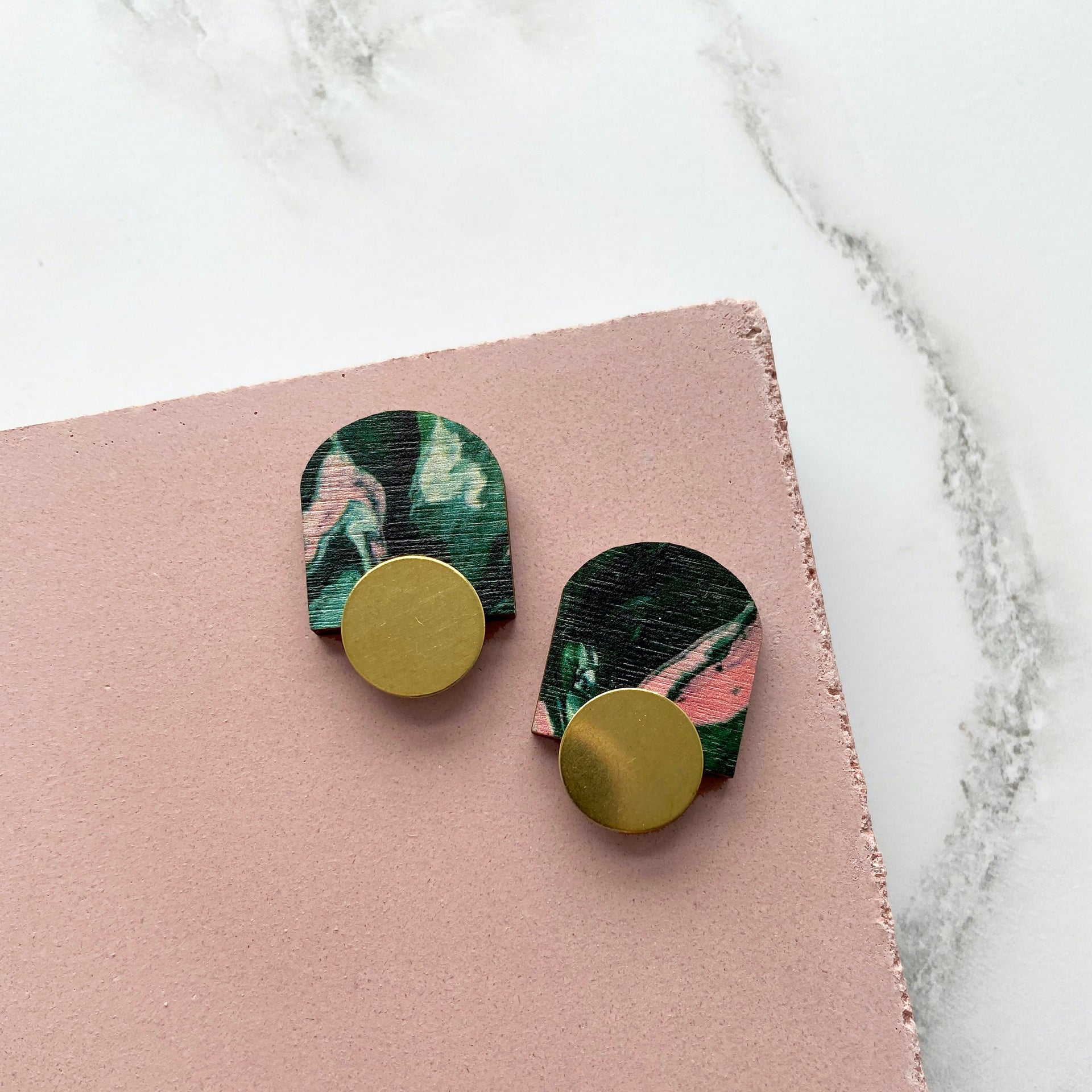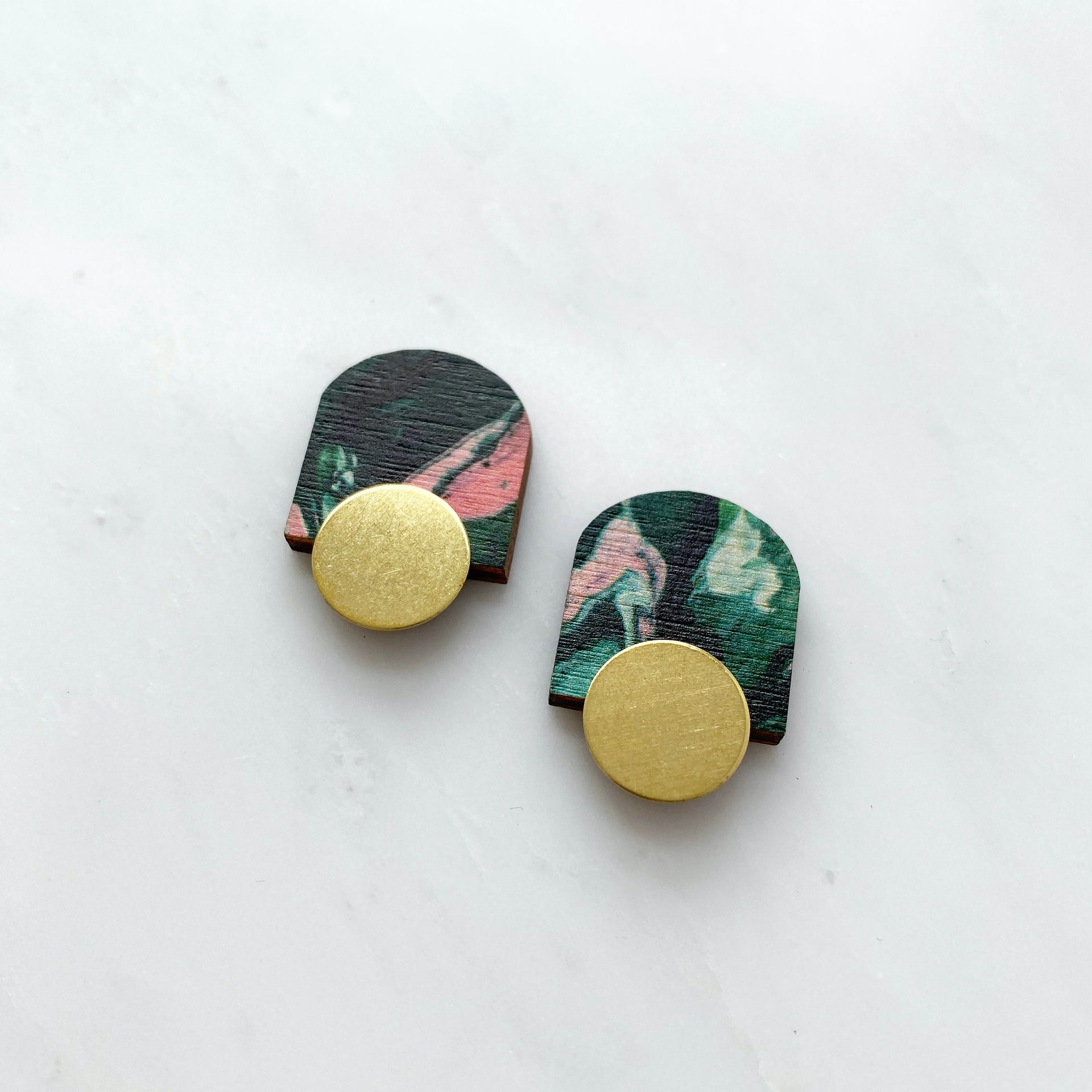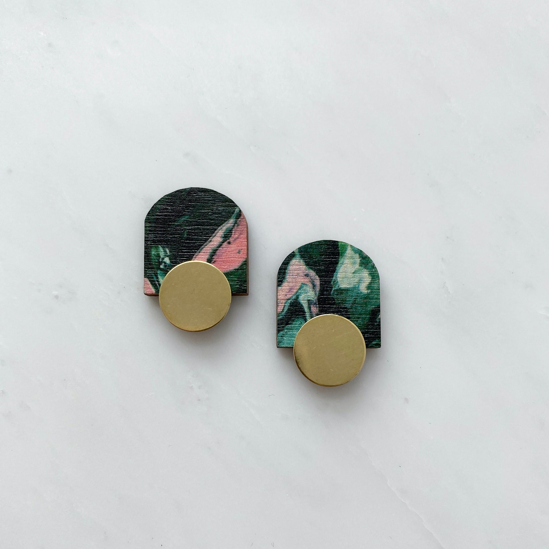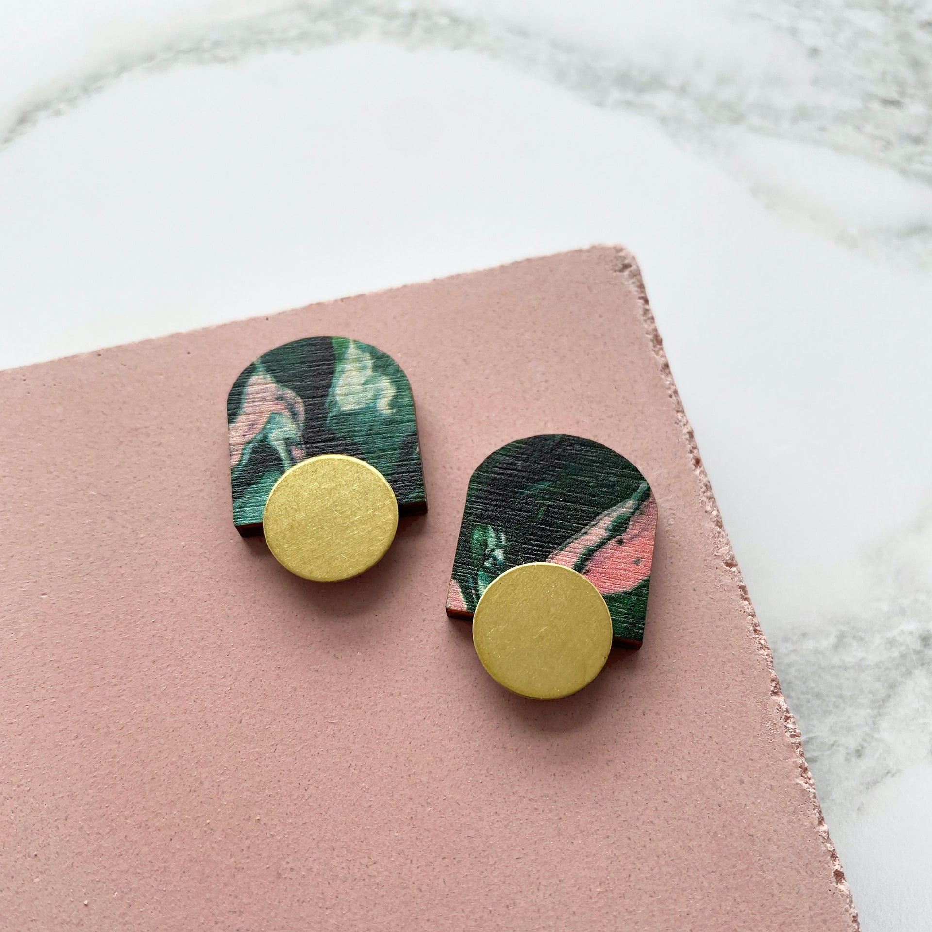 Modern arch stud earrings, made from marble printed wood and brass detail