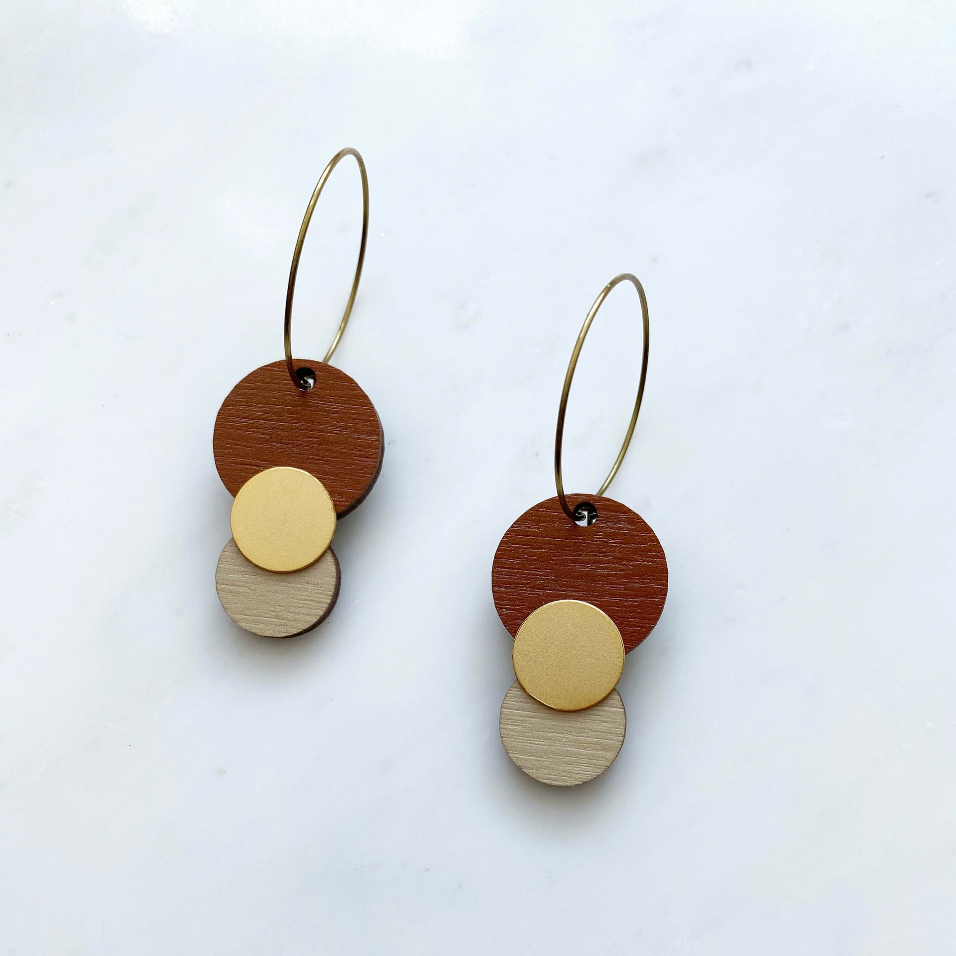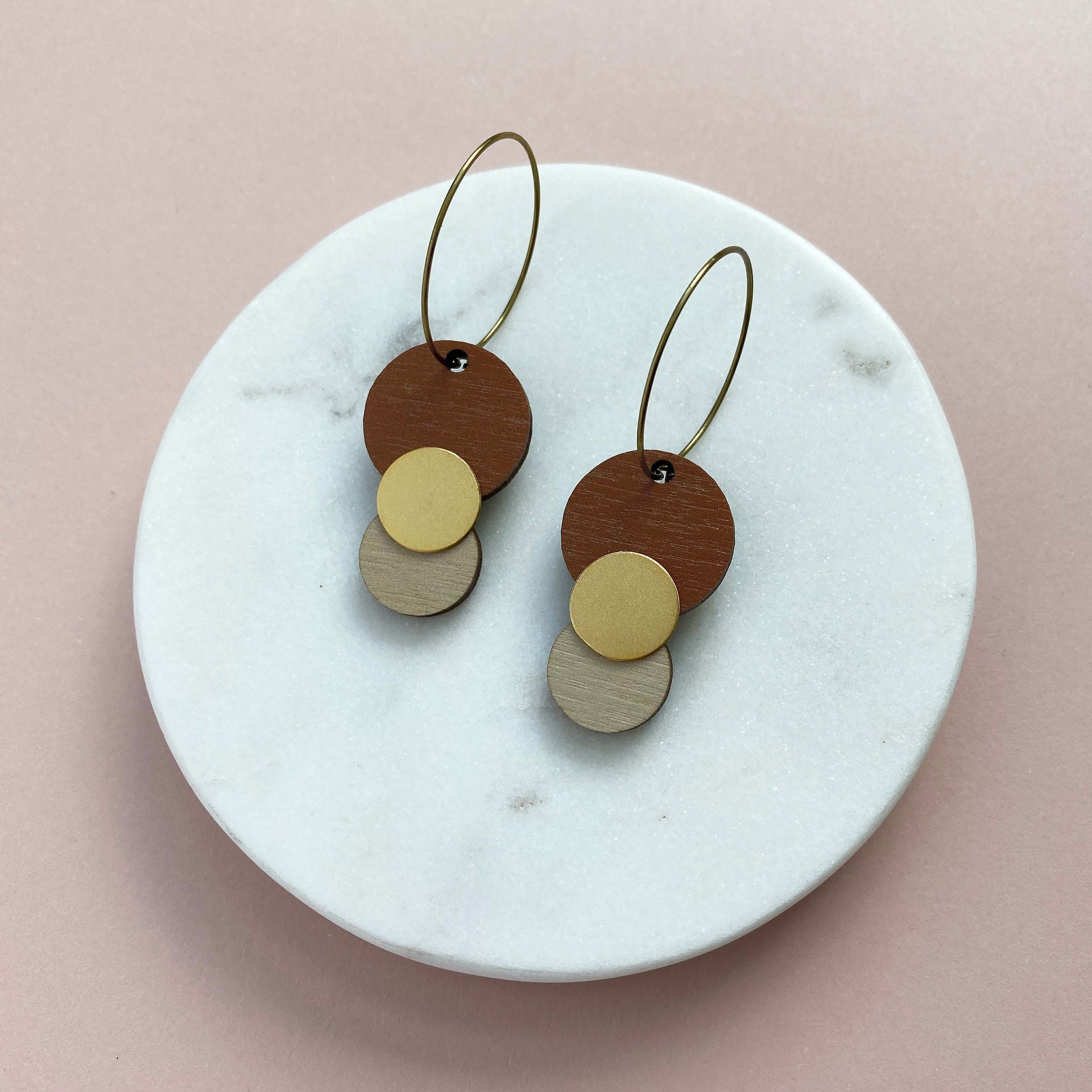Beautiful burnt orange & cream circle hoop earrings, featuring a matte gold detailing