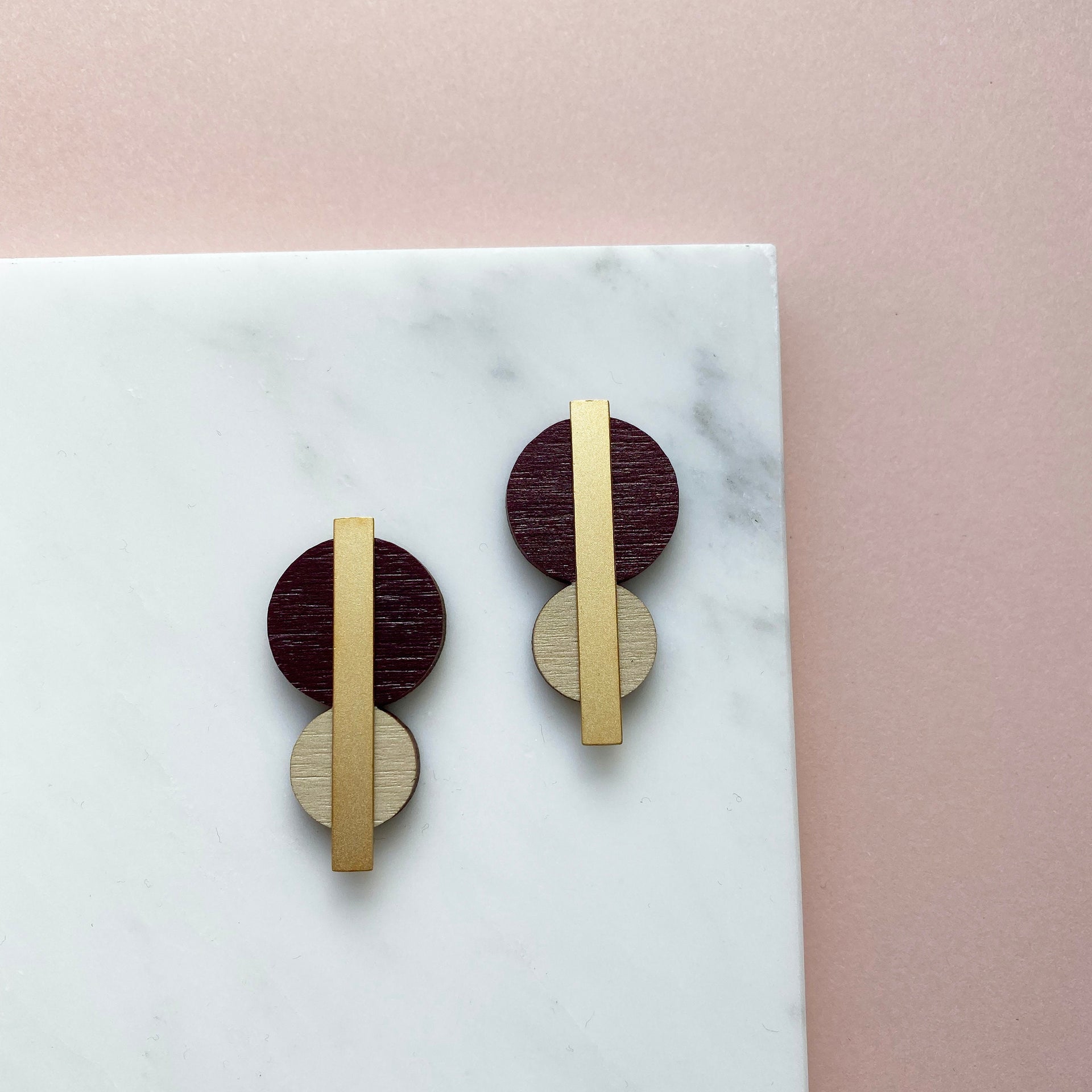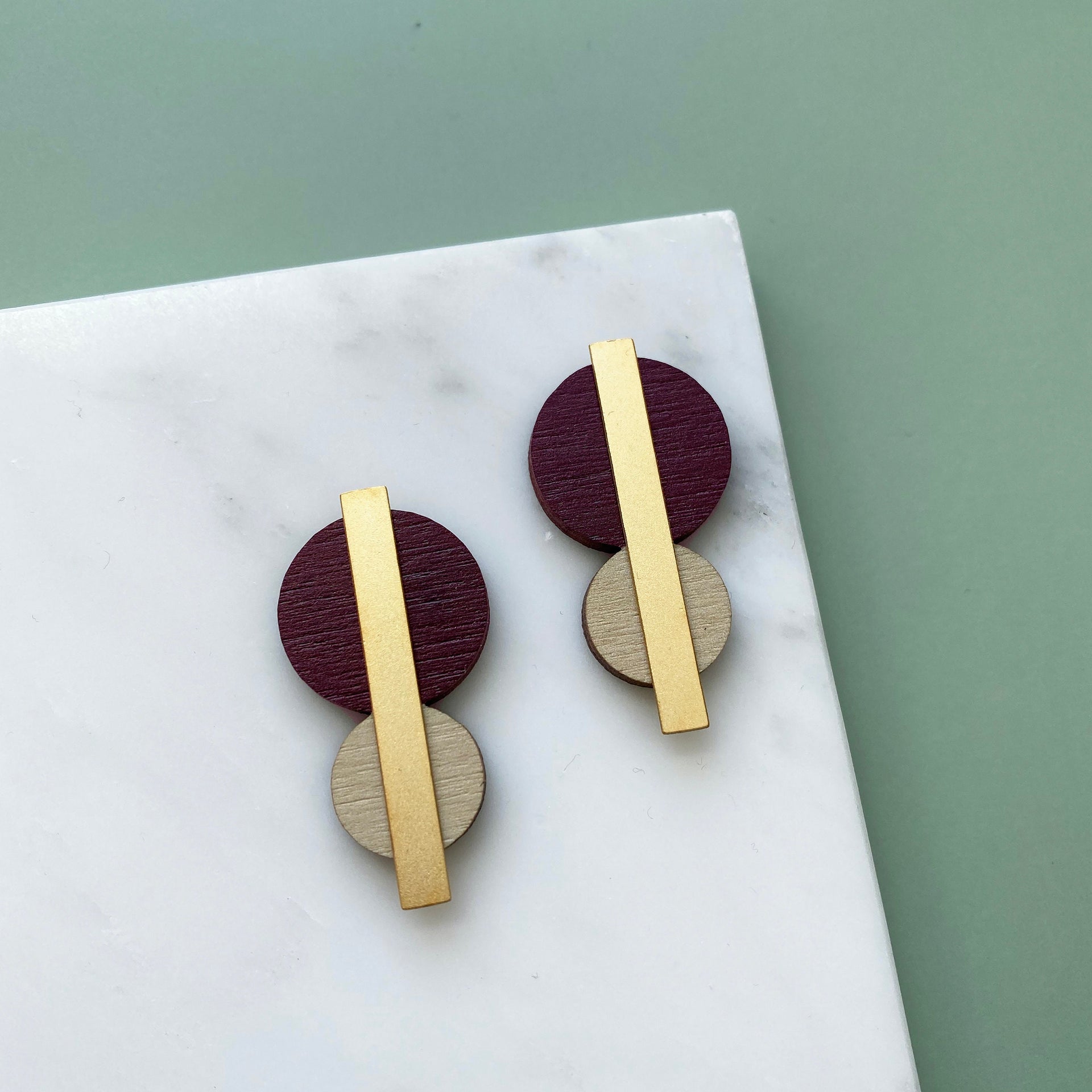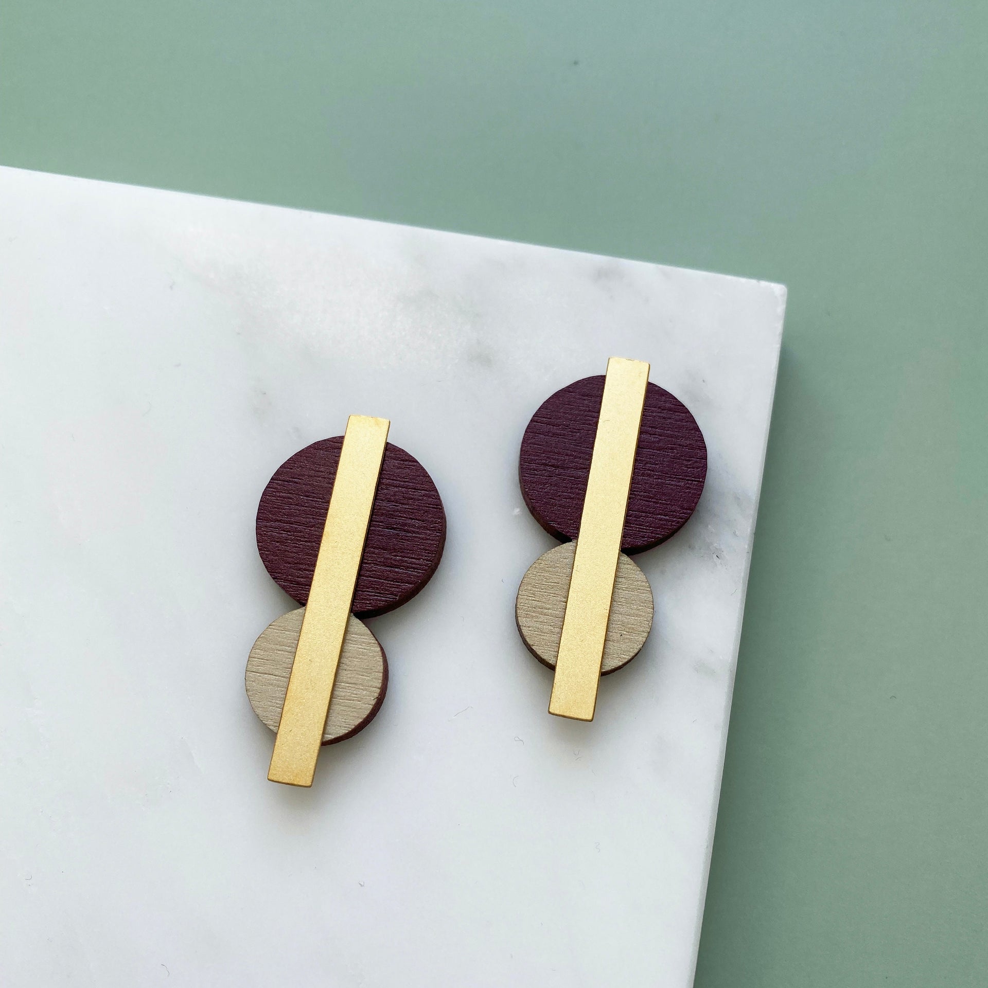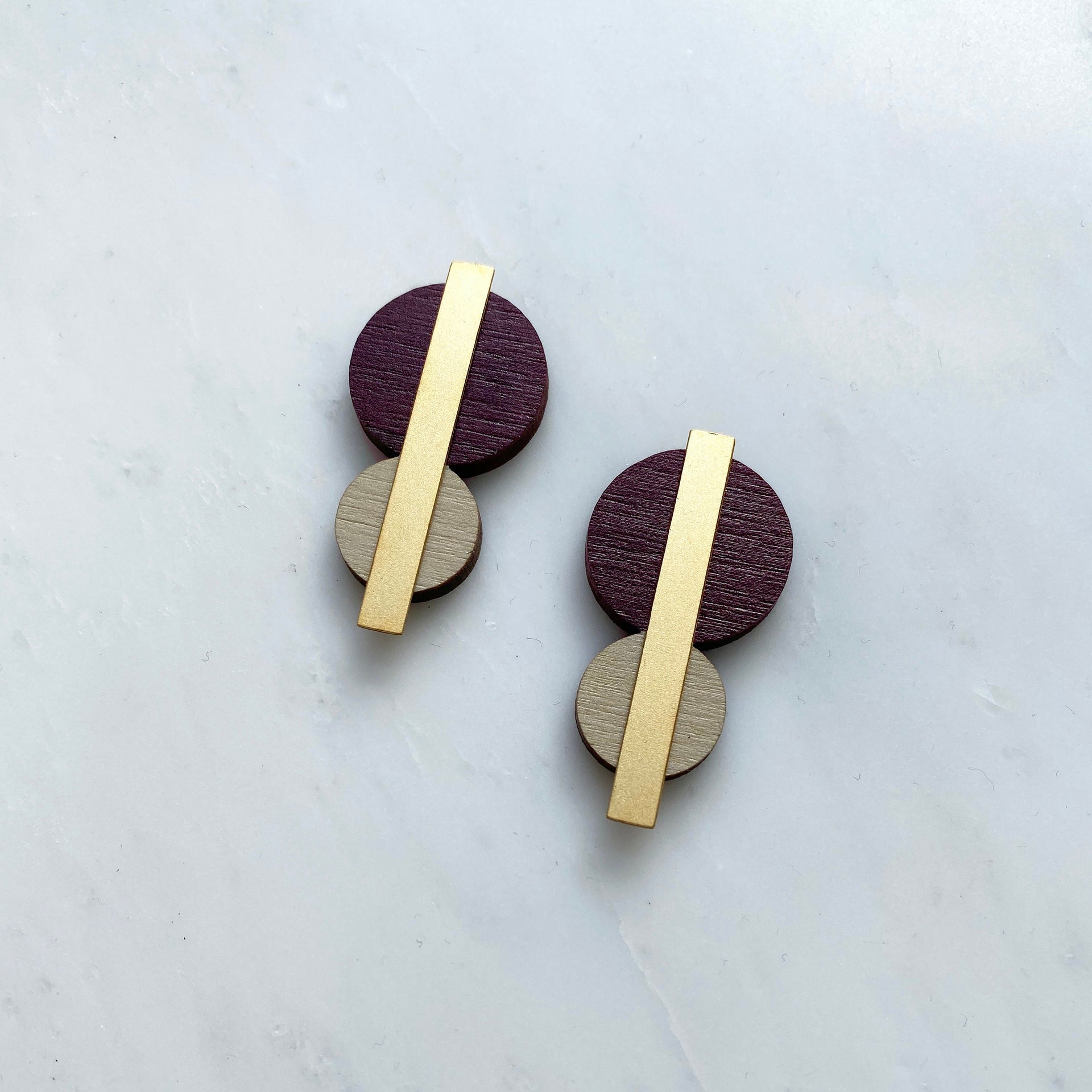 Purple, Cream & Gold Circle Studs - Statement Geometric Stud Earrings