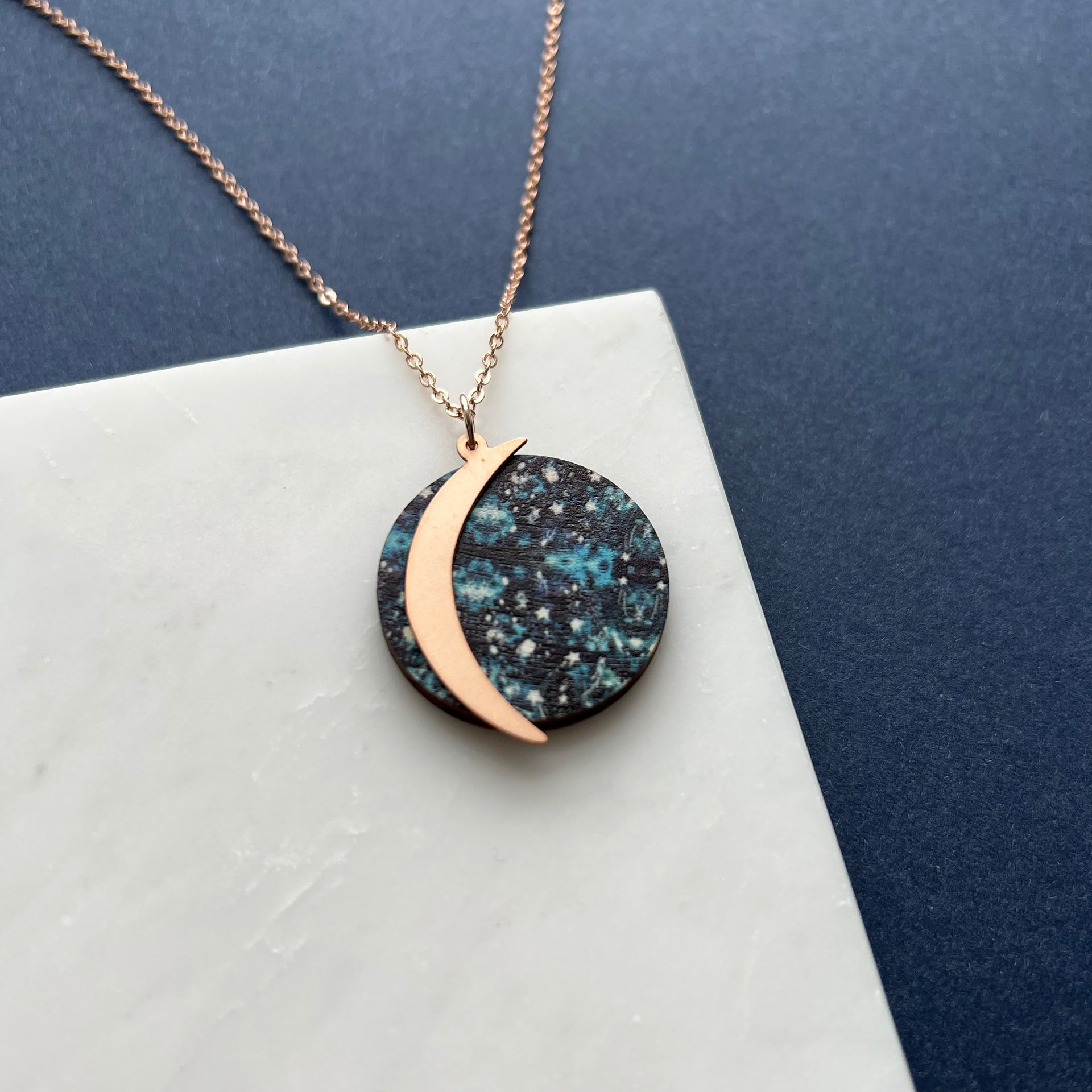 A stunning moon & galaxy print pendant necklace, a perfect gift for those celestial lovers in your life