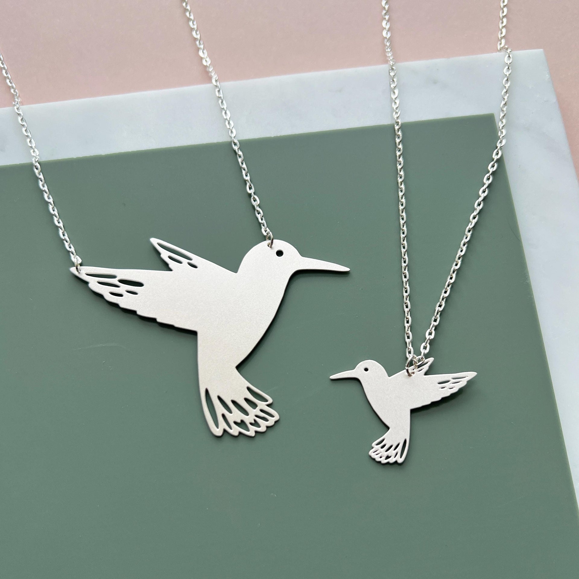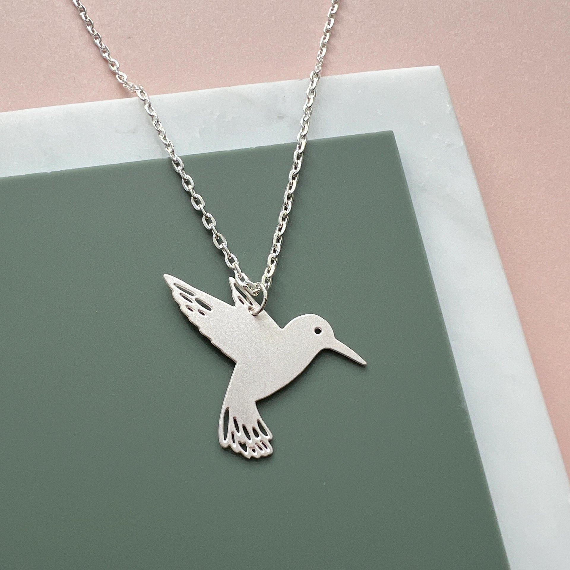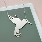 This hummingbird pendant comes in a choice of 2 sizes, mini - 3.5cm or large - 7cm and hangs on a 20 inch silver plated chain