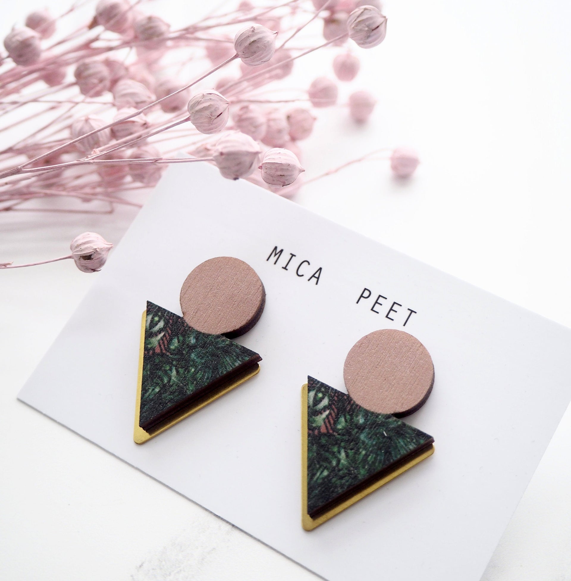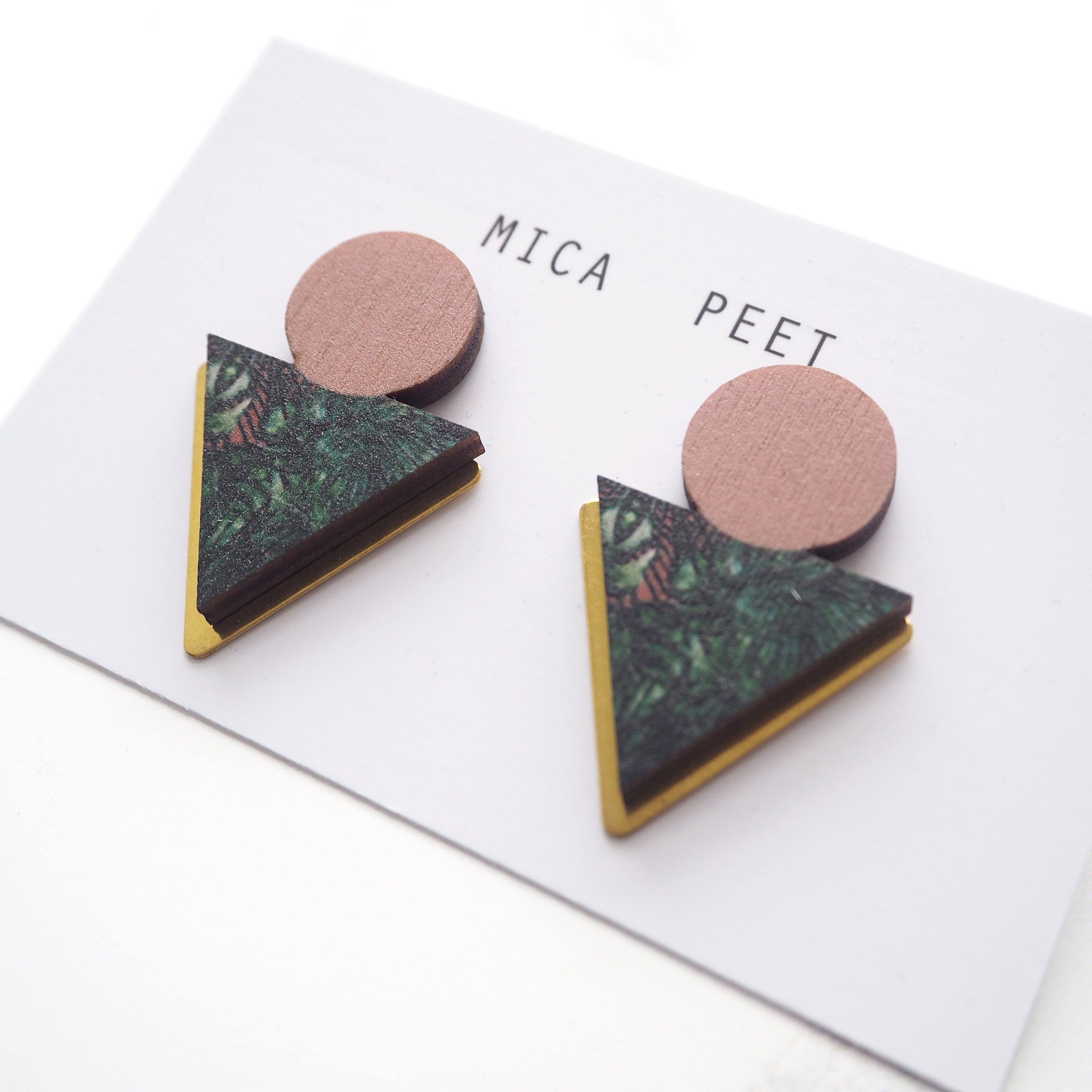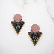 Featuring a pink circle and green triangle which is backed with a larger brass triangle behind
