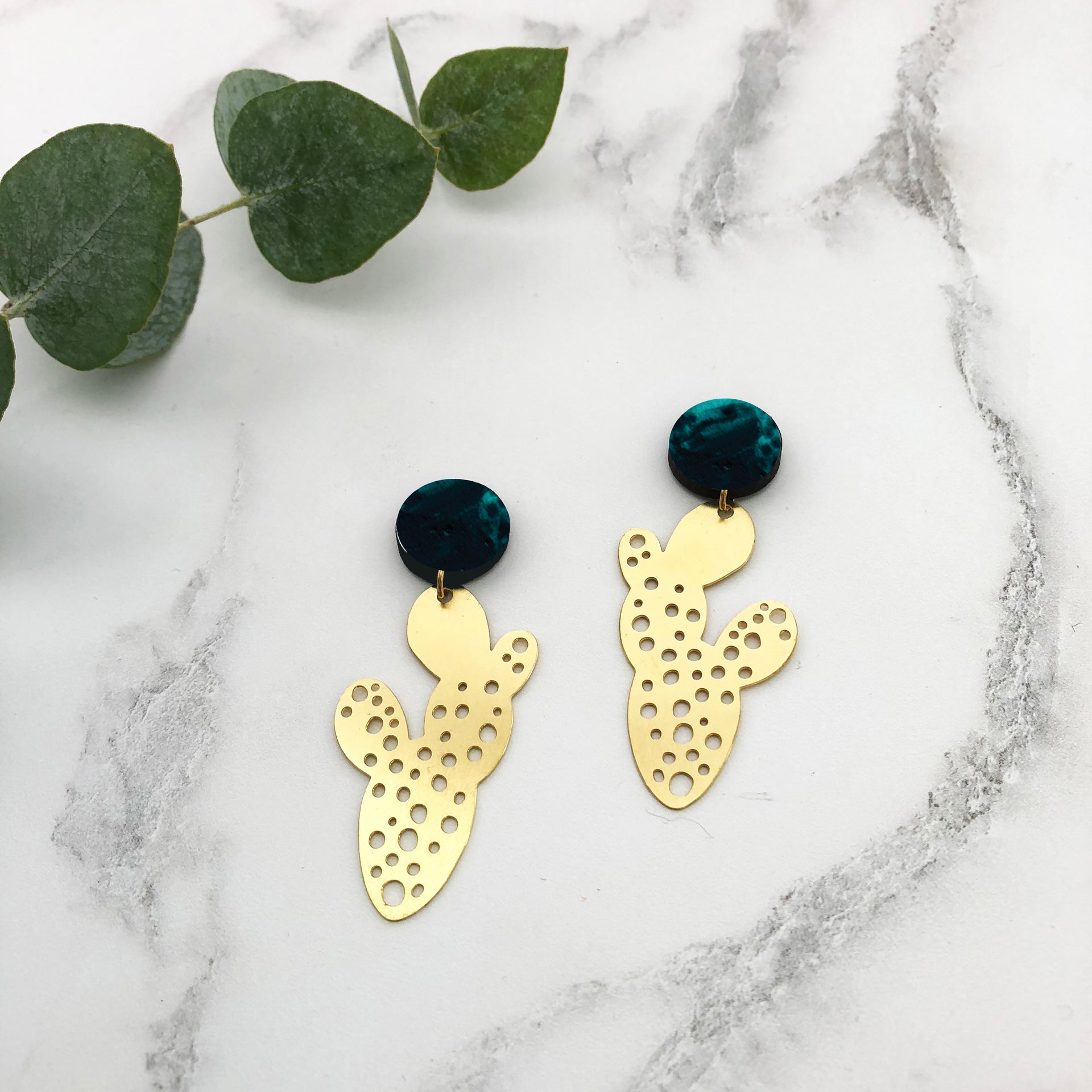 The cactus part is made from laser cut nickel free brass plated with a lovely matt gold finish and the circle is made from high quality digitally printed FSC certified 3mm plywood, which is cut using a laser cutter and painted black on the reverse
