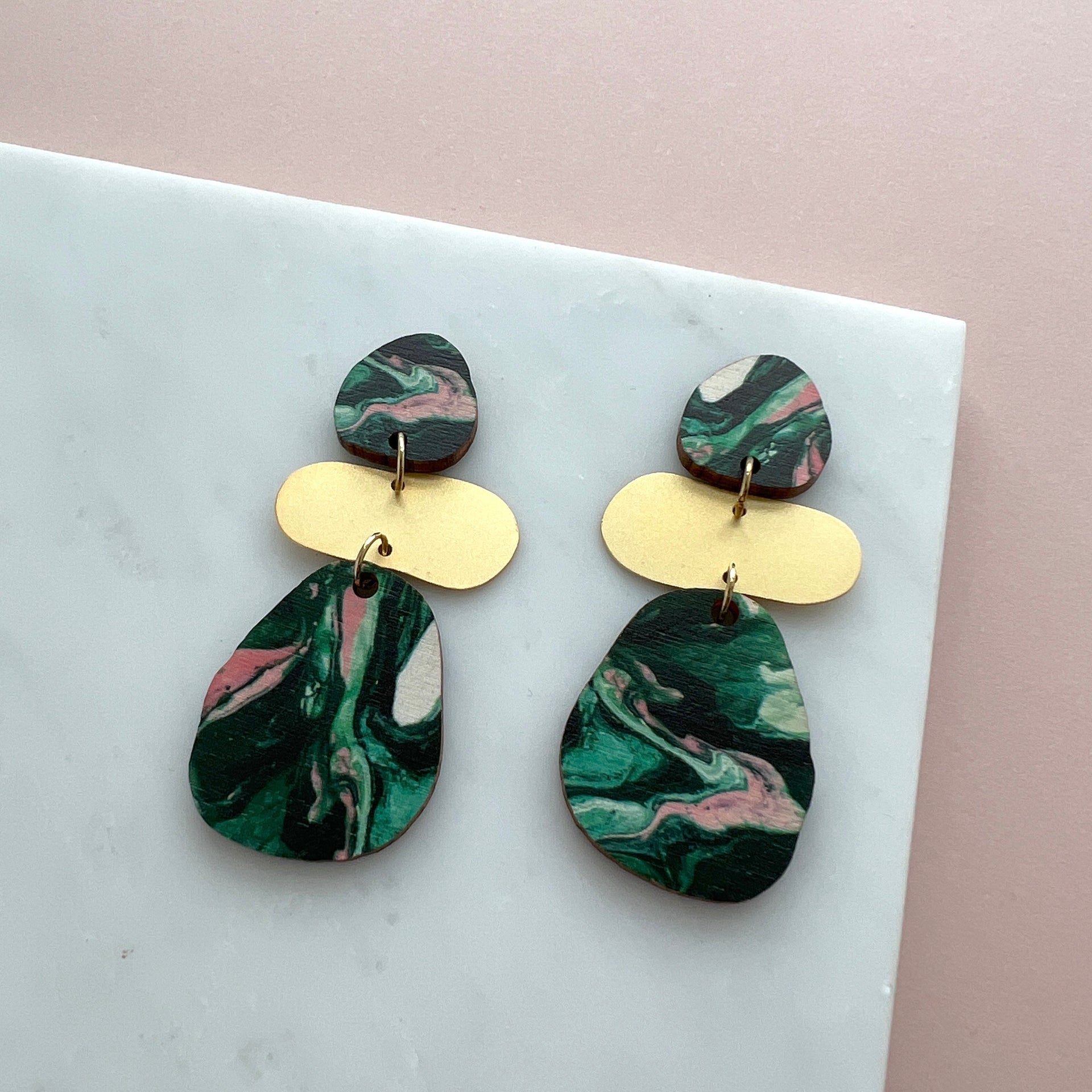 Statement Pebble Drop Stud Earrings - Green, Pink & Gold