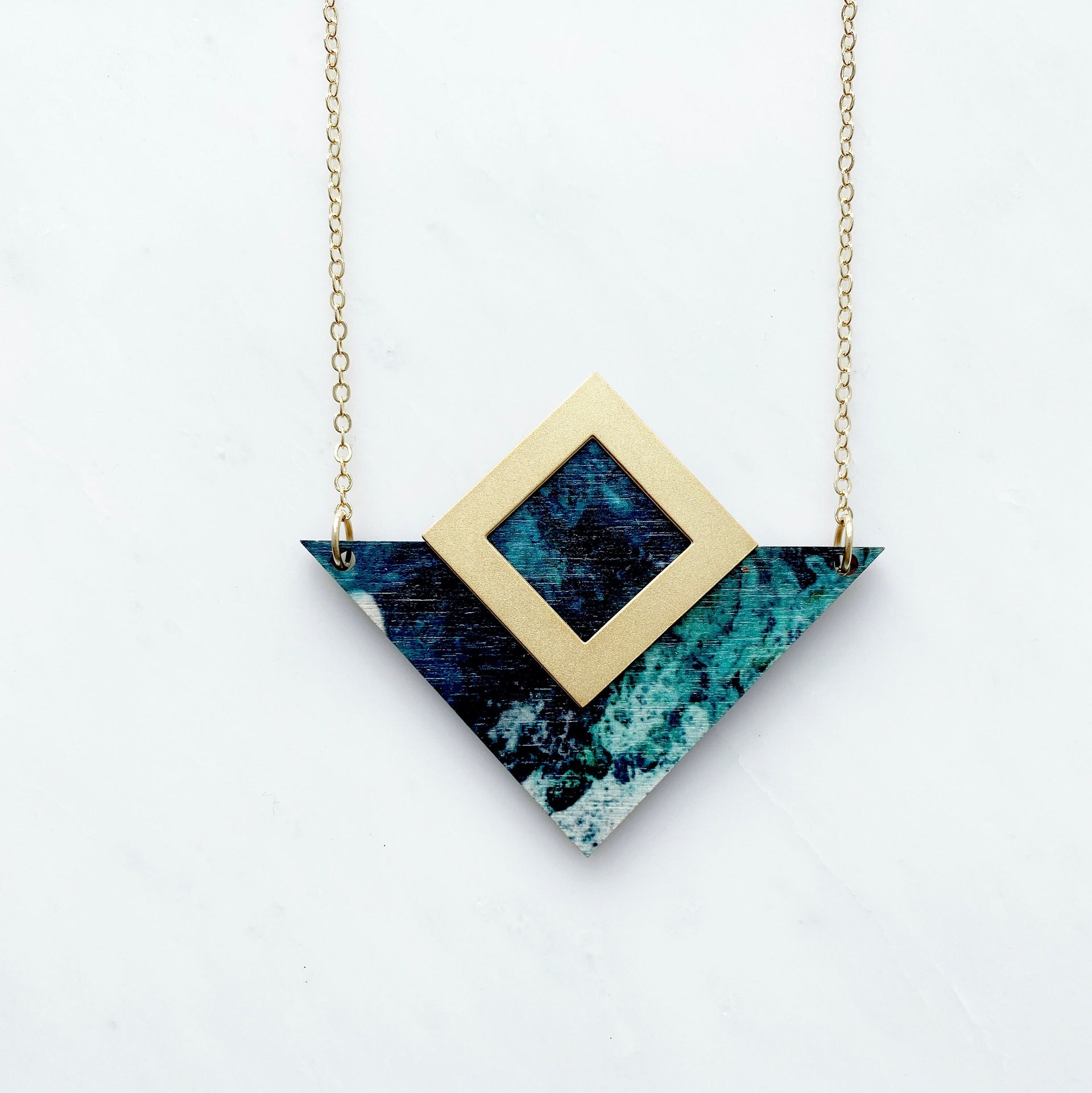 Made from FSC digitally printed ply wood and finished with a lovely matte gold plated geometric shape