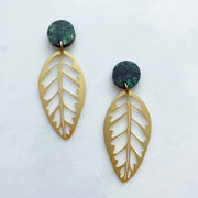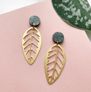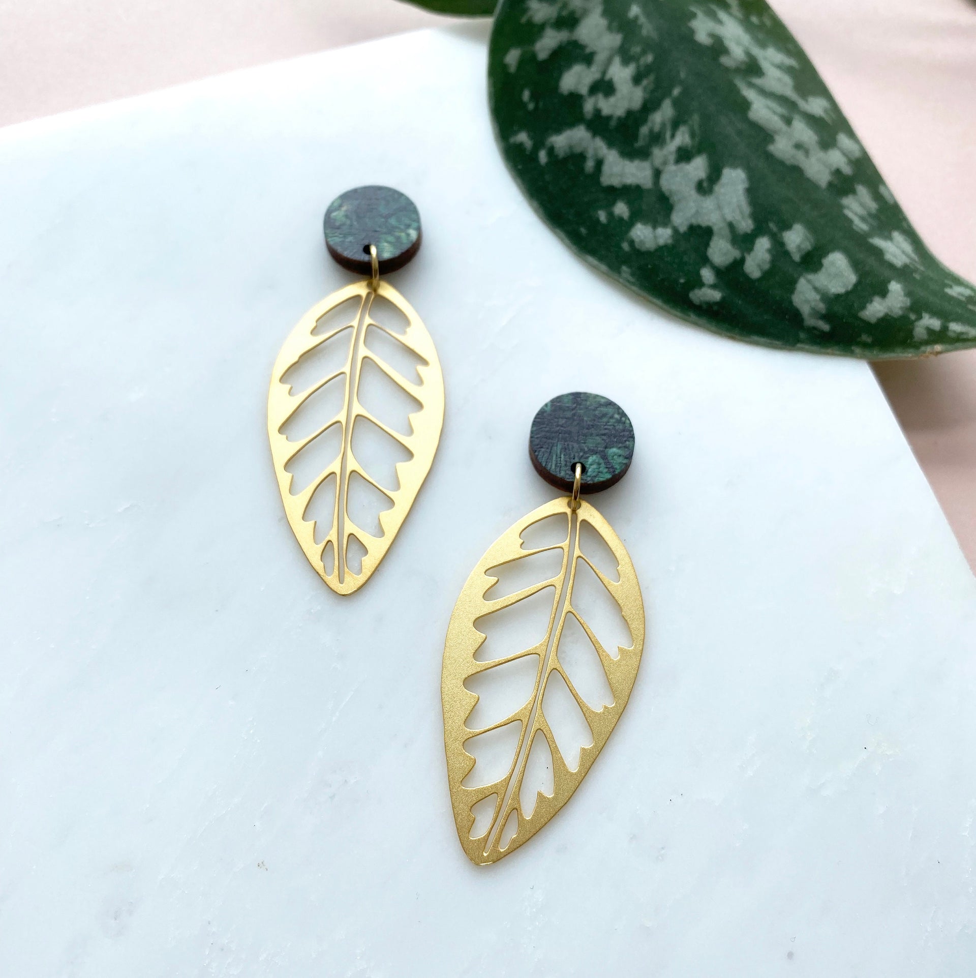 A fun and unique pair of statement gold leaf drop studs, Inspired by the Calathea Zebrina house plant