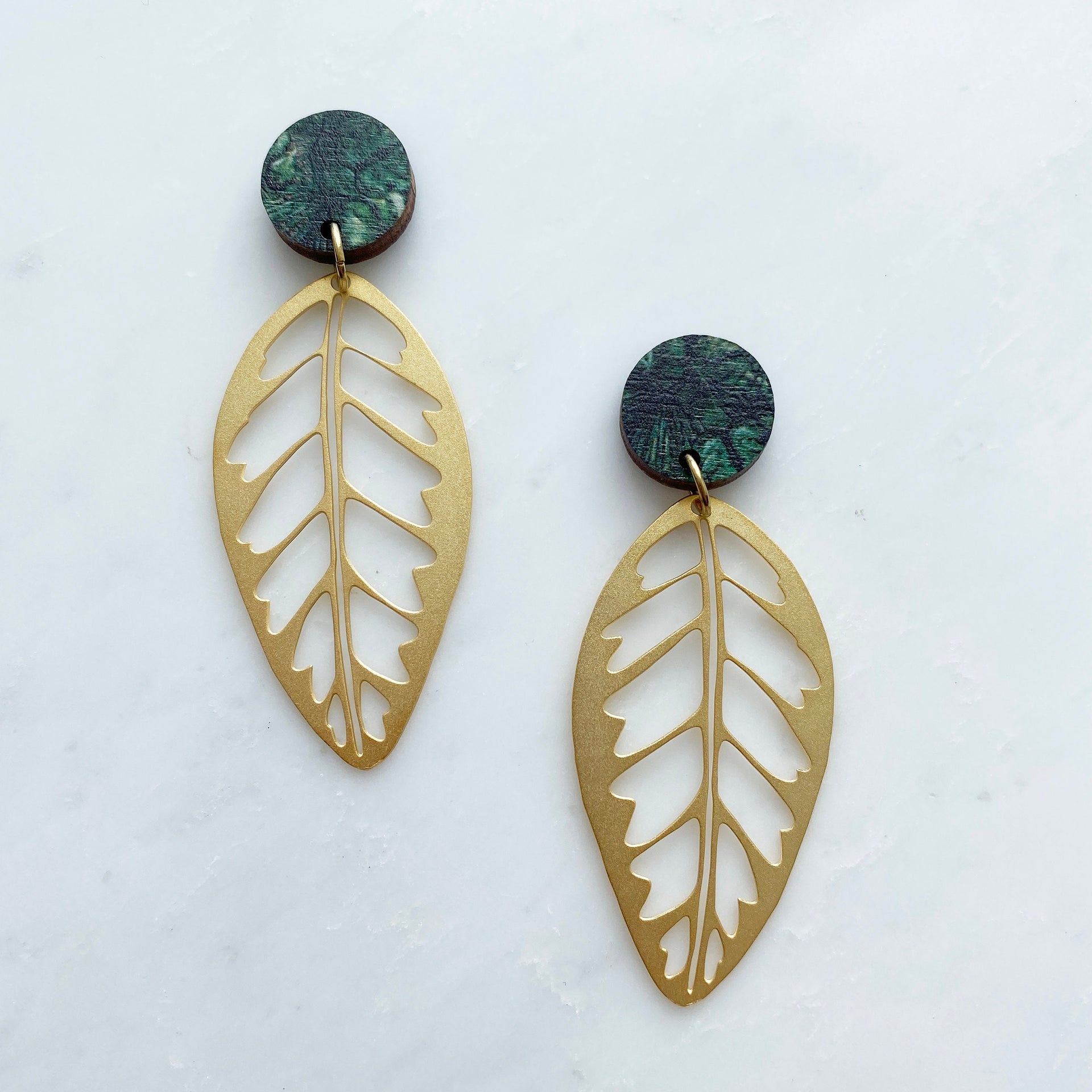 Featuring a printed wooden circle with a matte gold plated leaf shape, A must have fashion accessory for any house plant lover