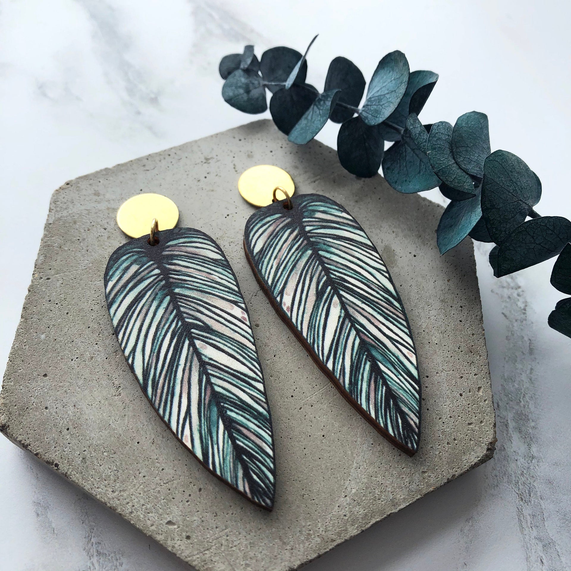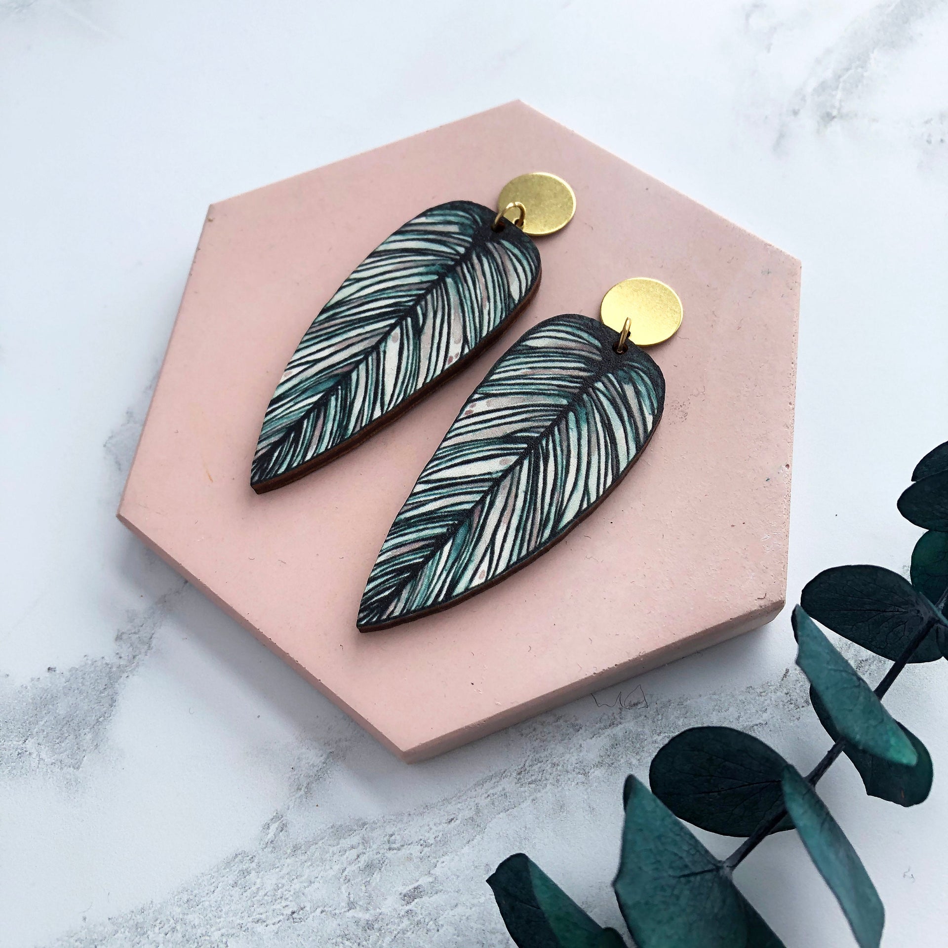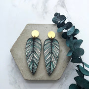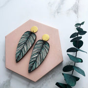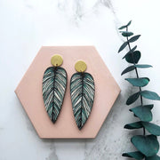 A beautifully detailed pair of tropical leaf earrings, inspired by the Calathea Whitesar houseplant