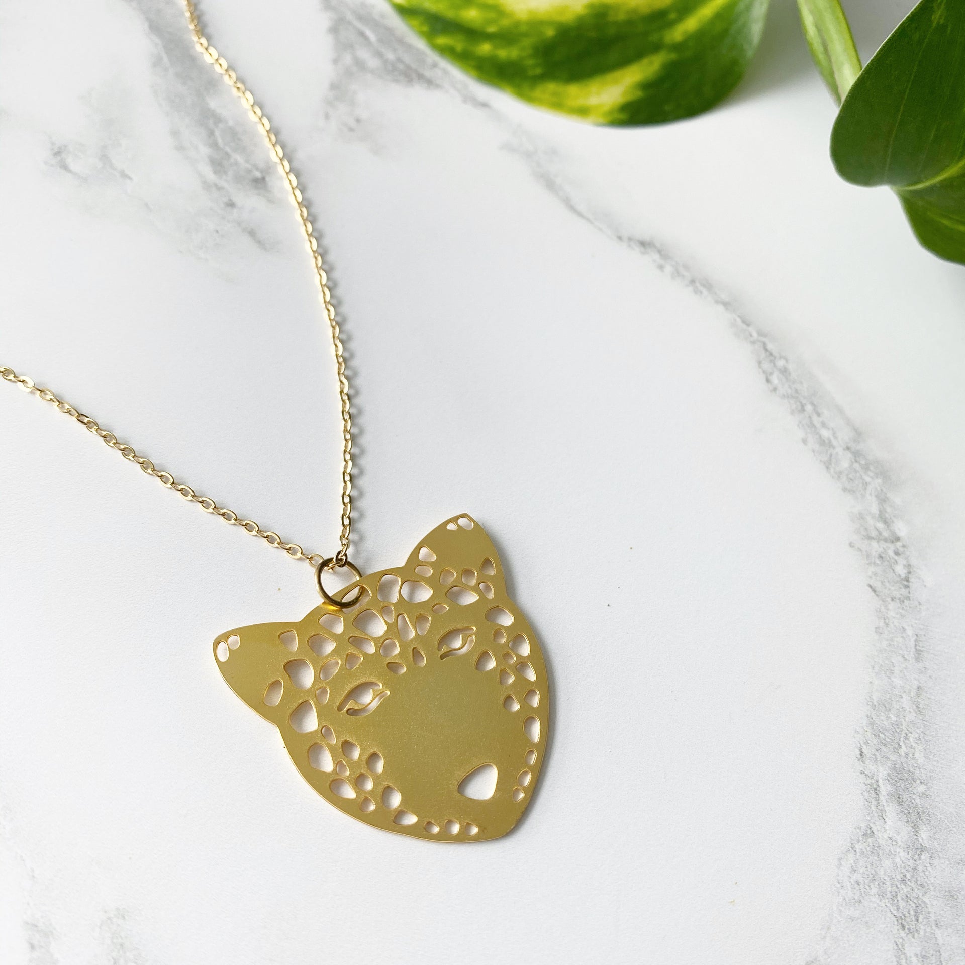 A beautiful and unique gold leopard necklace, made from my own original illustration which has been laser cut in nickel free brass and plated with a high quality matt gold finish