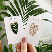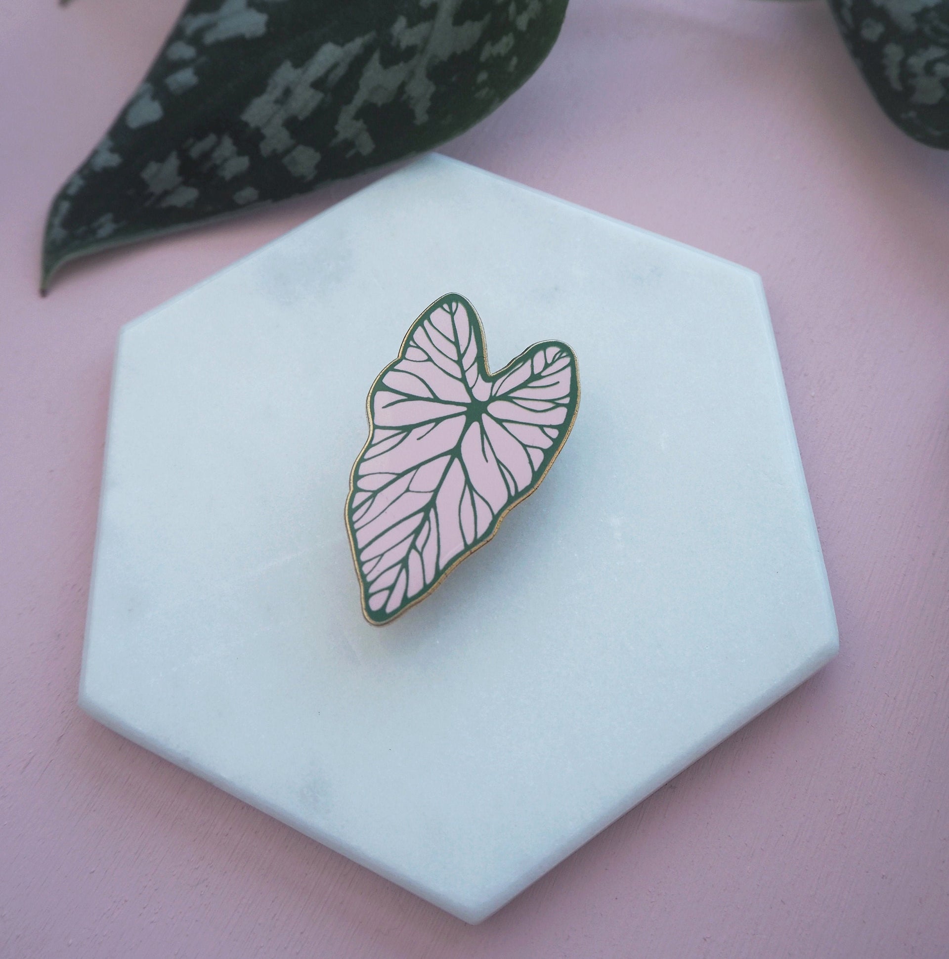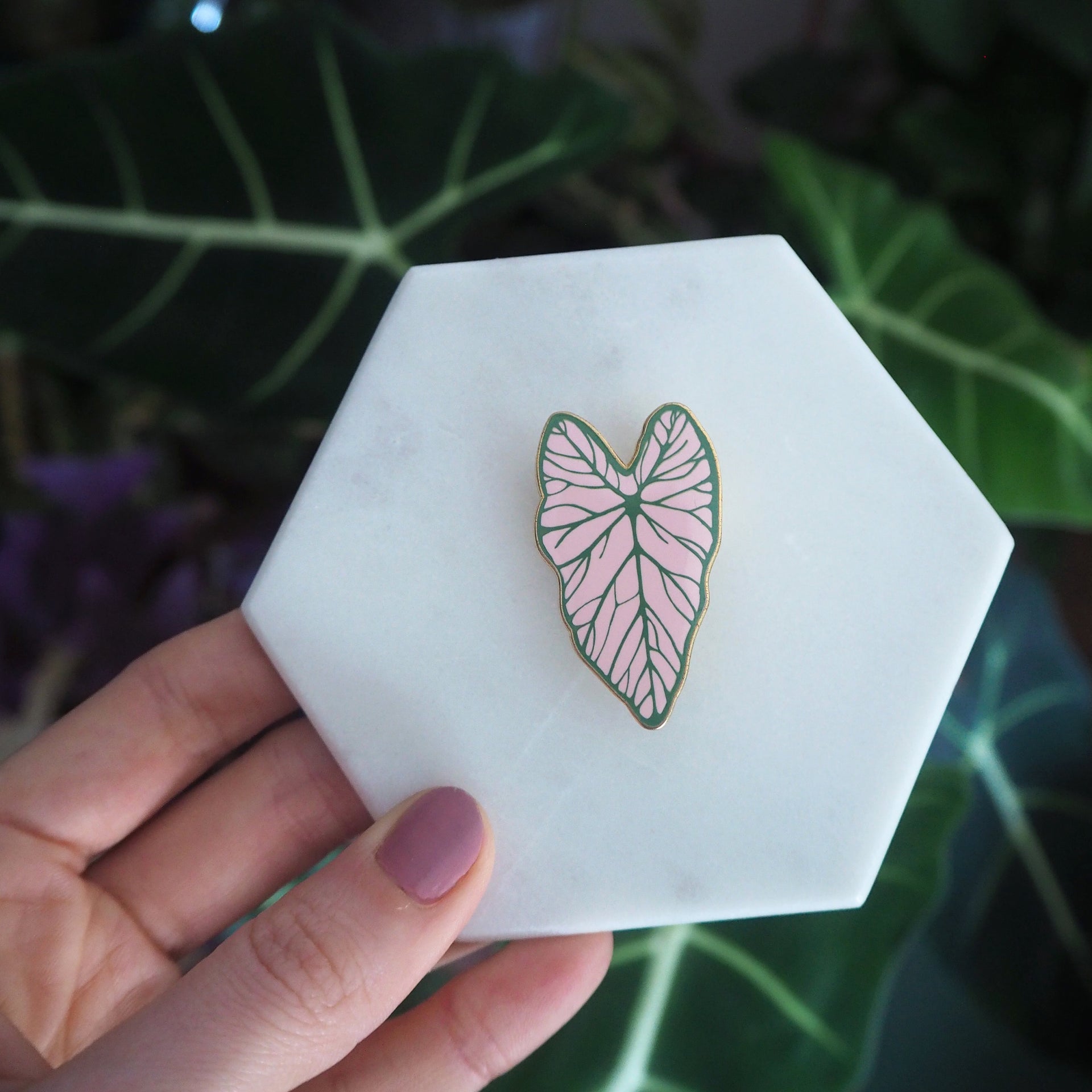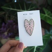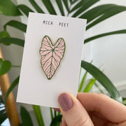 A beautiful pink leaf pin inspired by the leaves of a caladium house plant, based upon my original illustration