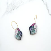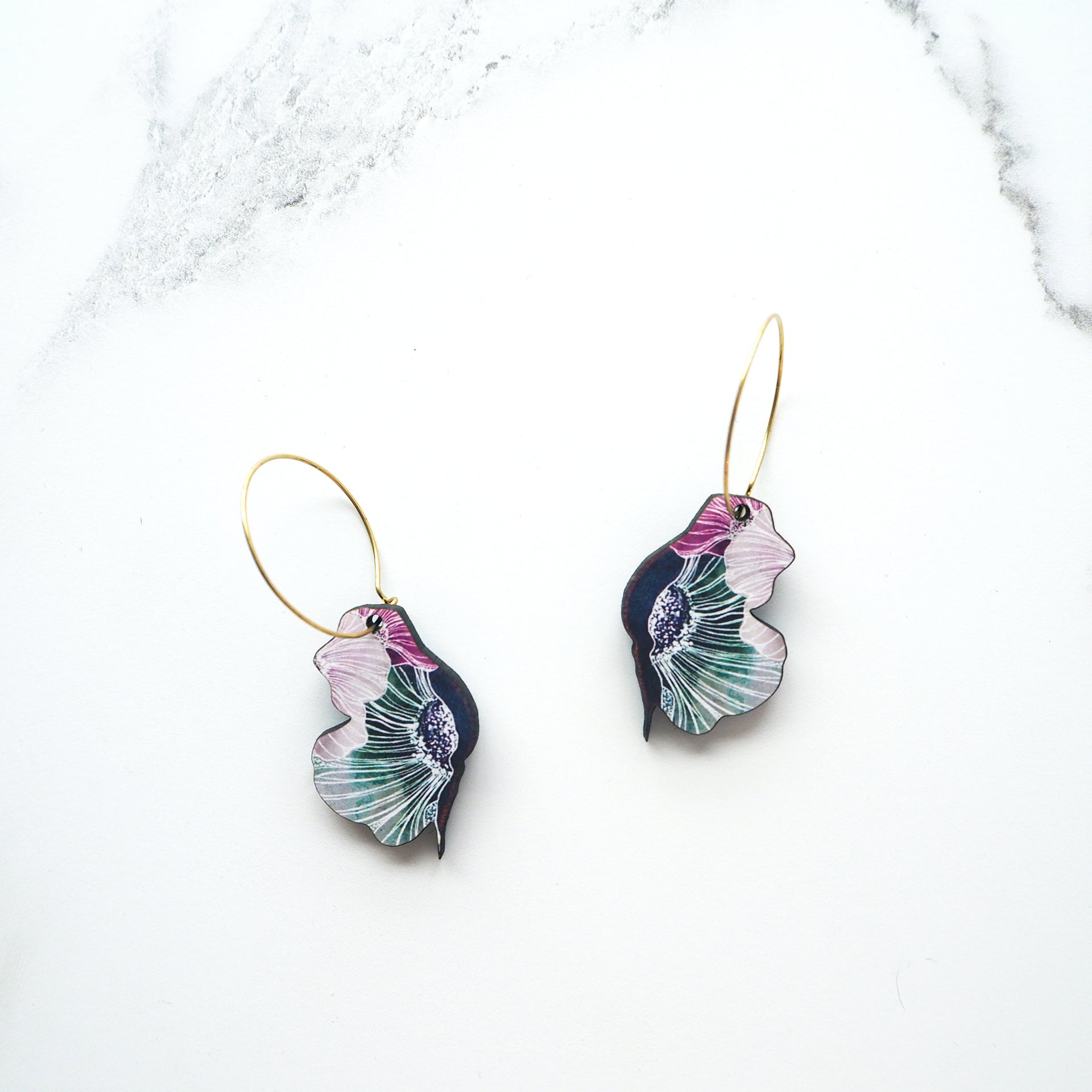 A stunning pair of blue printed anemone flower hoop earrings featuring my own unique botanical illustration