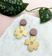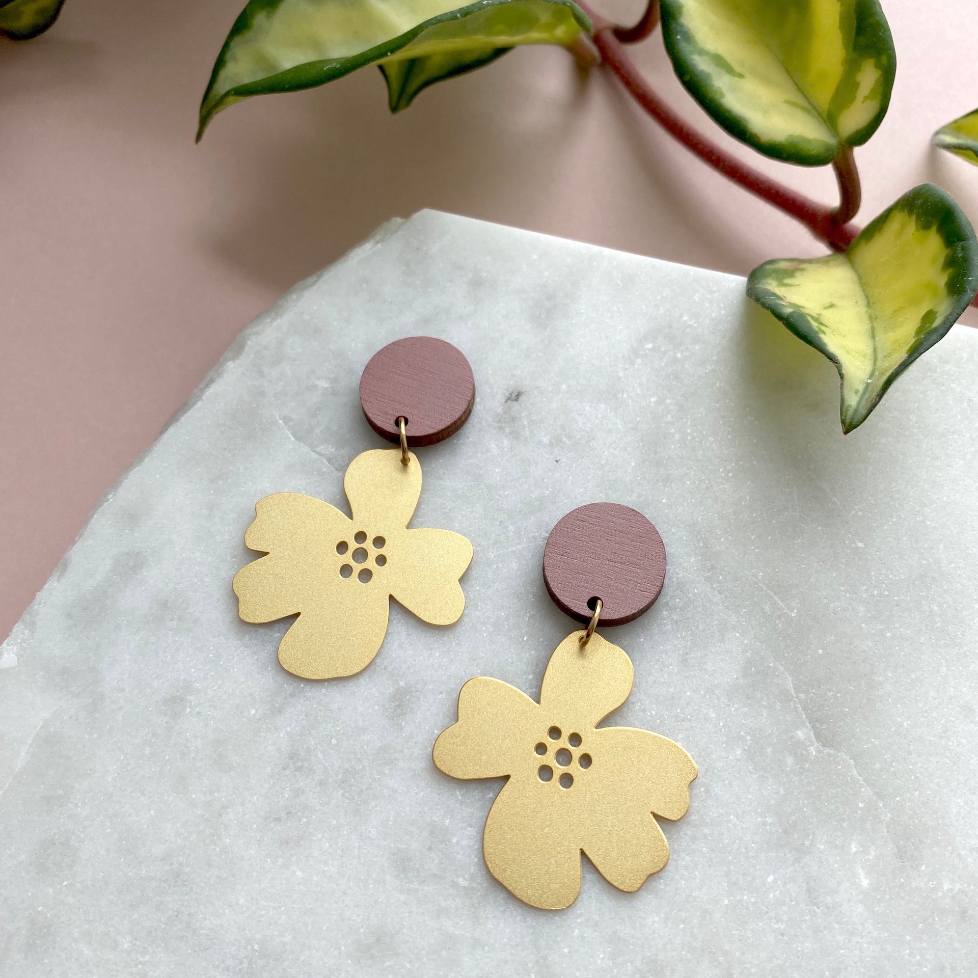 Featuring a printed pink wooden circle with a matte gold plated flower shape