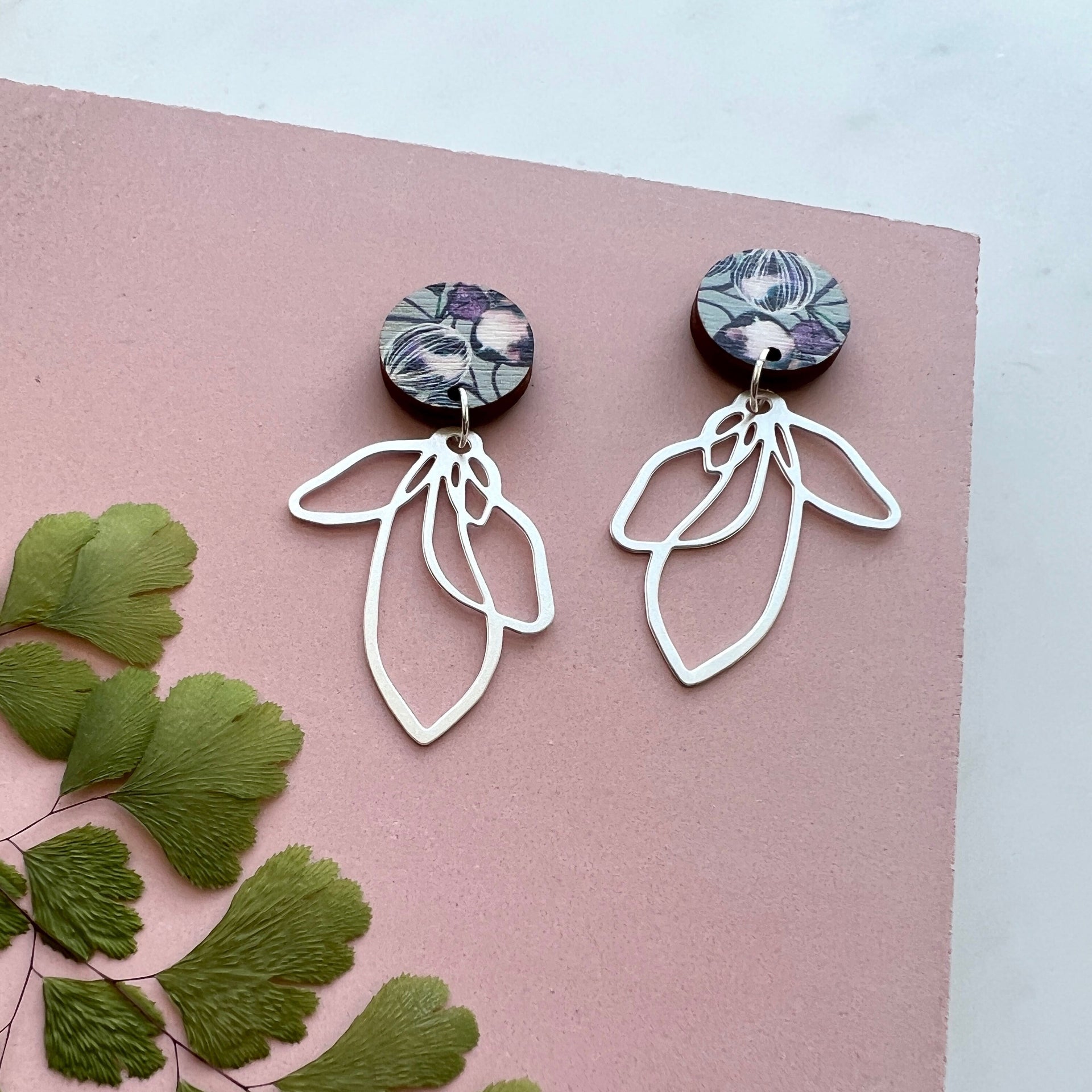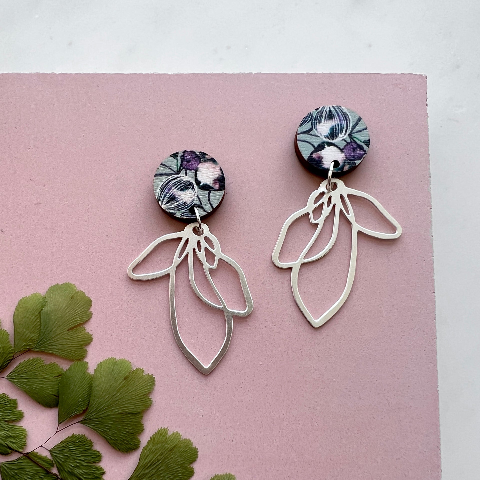 Featuring a blue & purple printed circle with a matte silver plated abstract petal shape