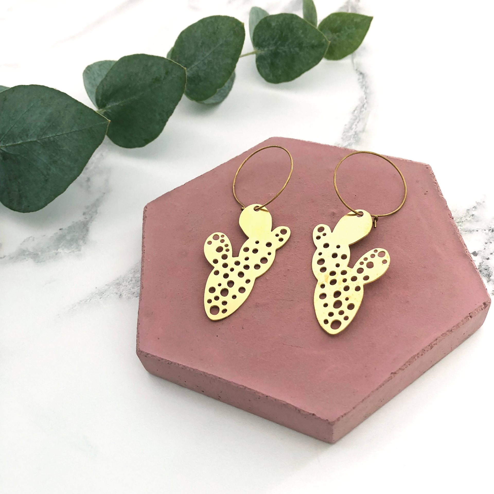 The cactus part is made from laser cut nickel free brass plated with a lovely matt gold finish