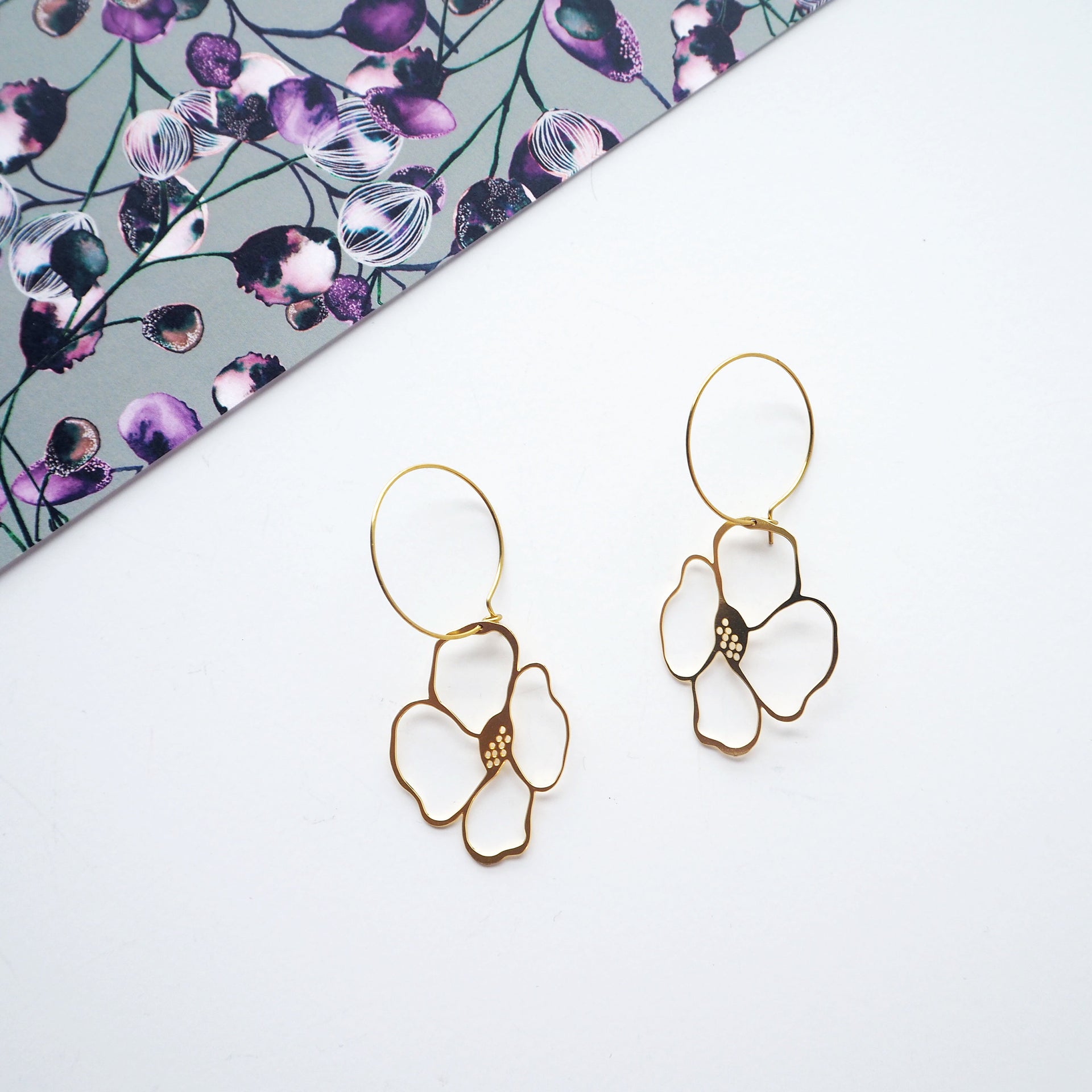 A beautiful & simple pair of gold anemone floral hoop earrings