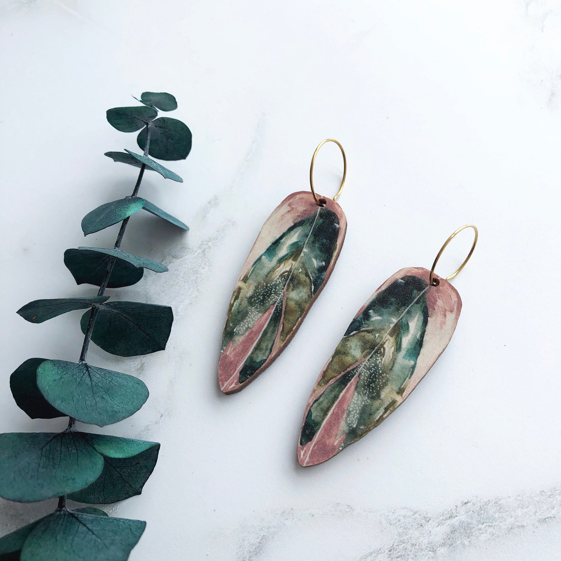 A pretty pair of Stromanthe Tristar leaf hoop earrings