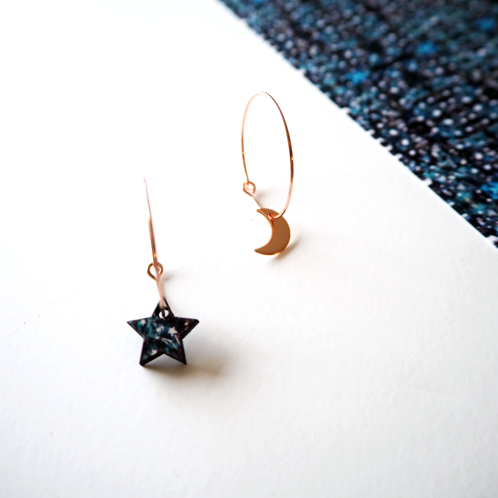 All my jewellery is made from high quality digitally printed FSC certified 3mm plywood, which is cut using a laser cutter and painted black on the reverse and the moon is matte rose gold plating over nickel free brass