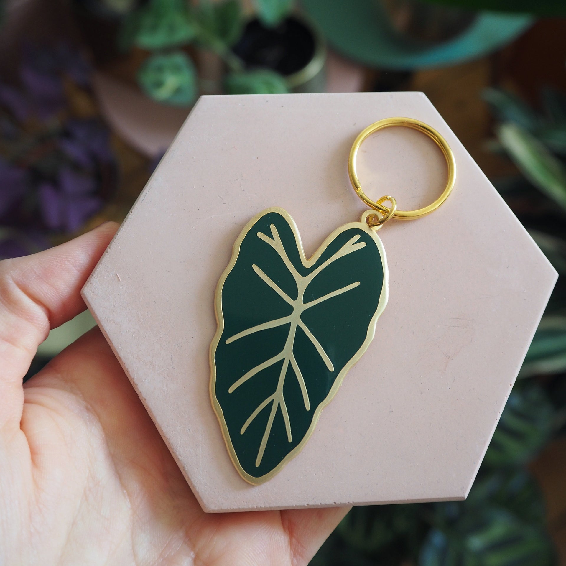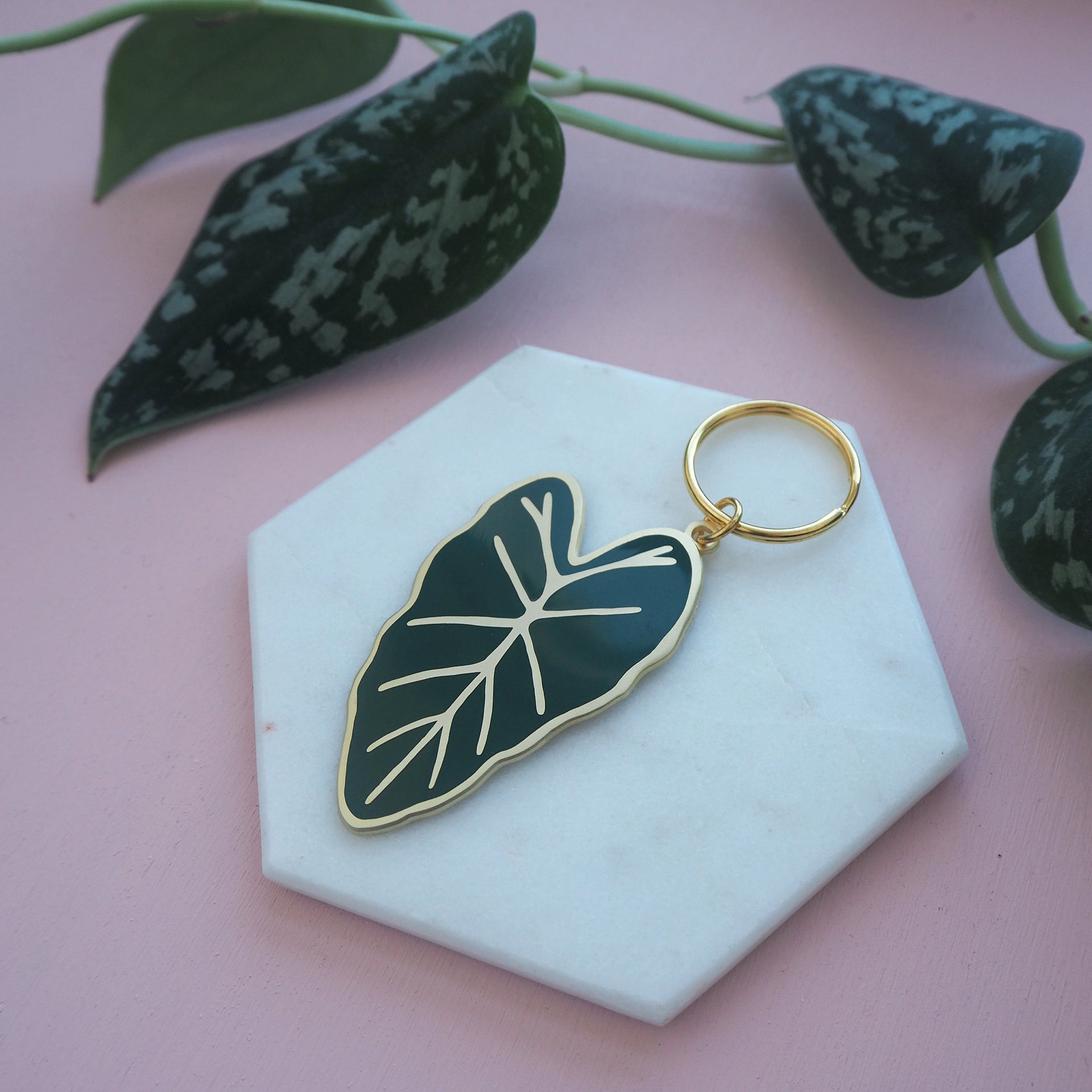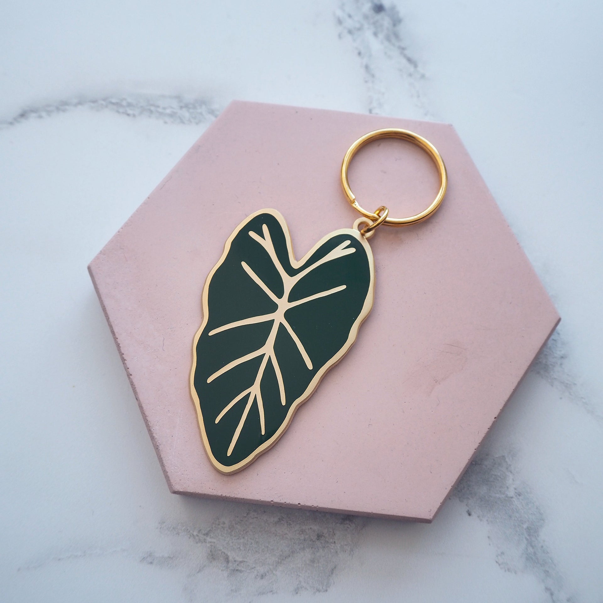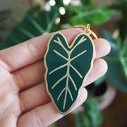 A dark green & matte gold enamel Alocasia plant keychain, inspired by one of my favourite houseplants in my collection, the Alocasia Frydek