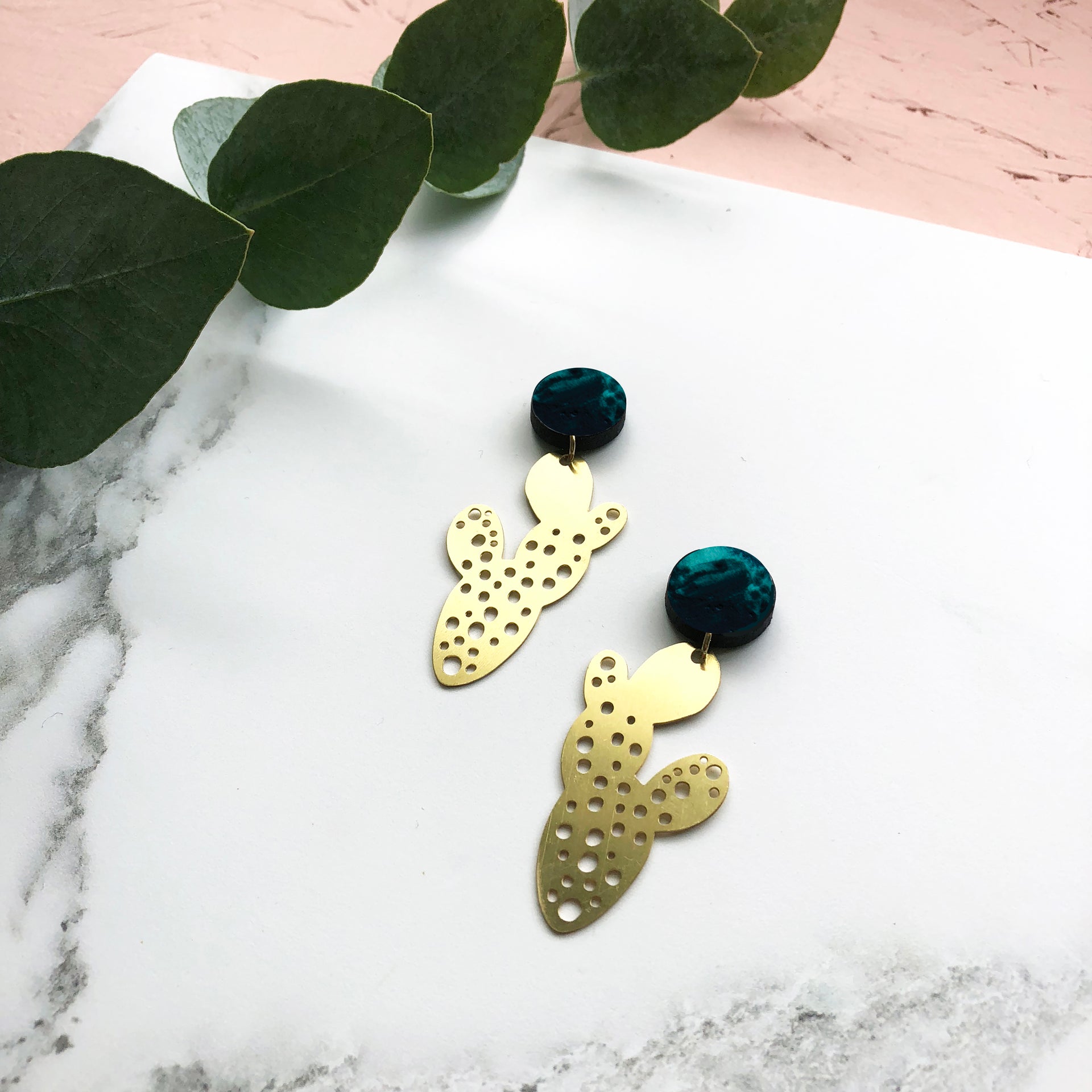 The cactus part is made from laser cut nickel free brass plated with a lovely matt gold finish and the circle is made from high quality digitally printed FSC certified 3mm plywood, which is cut using a laser cutter and painted black on the reverse
