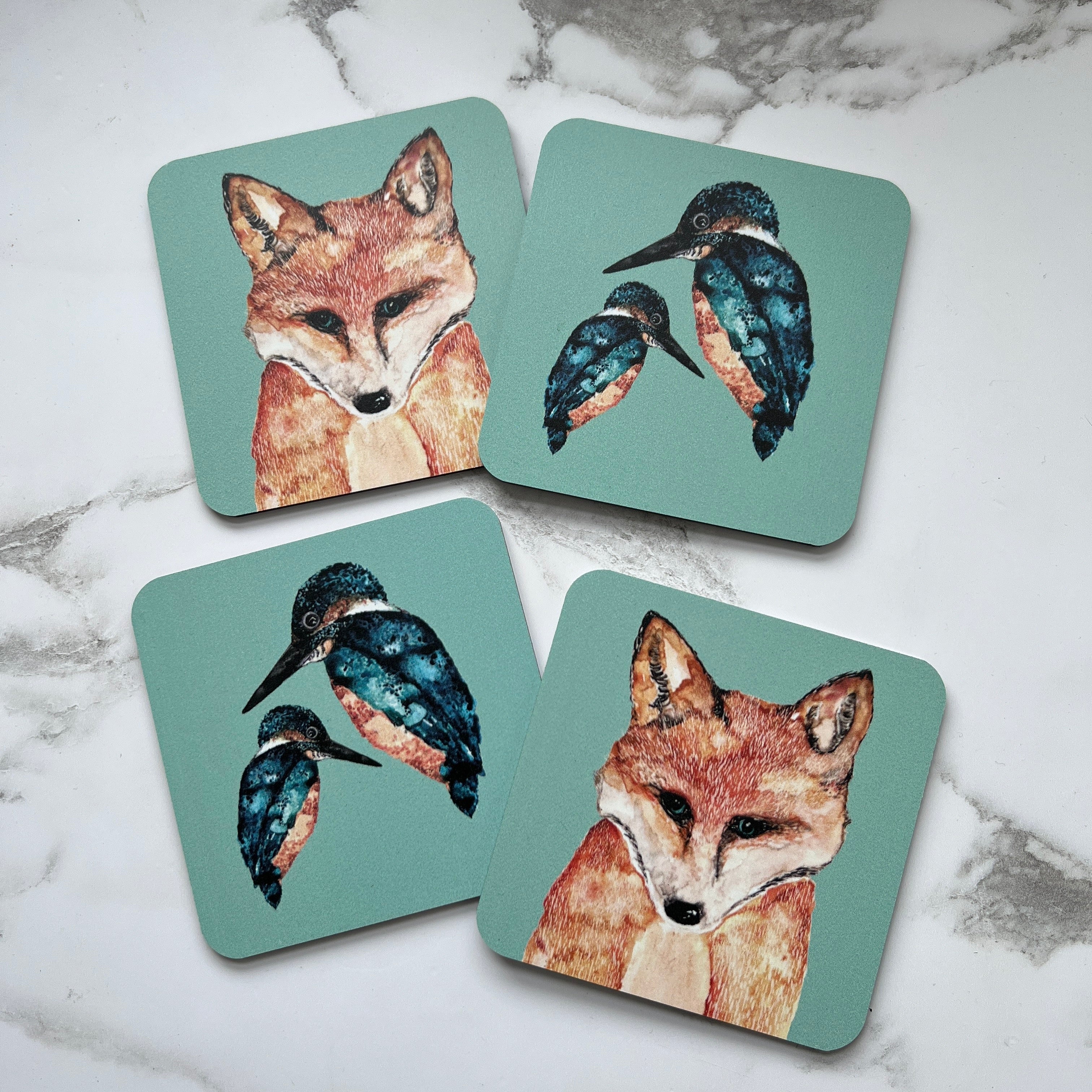 A lovely set of 4 fox and kingfisher bird coasters featuring my own watercolour illustrations