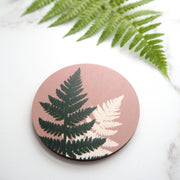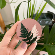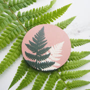 A beautiful and unique pink fern brooch, featuring my own illustration digitally printed on wood