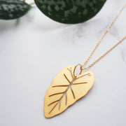 A stunning matte gold plated leaf necklace, inspired one of my favourite house plants, the Alocasia Frydek
