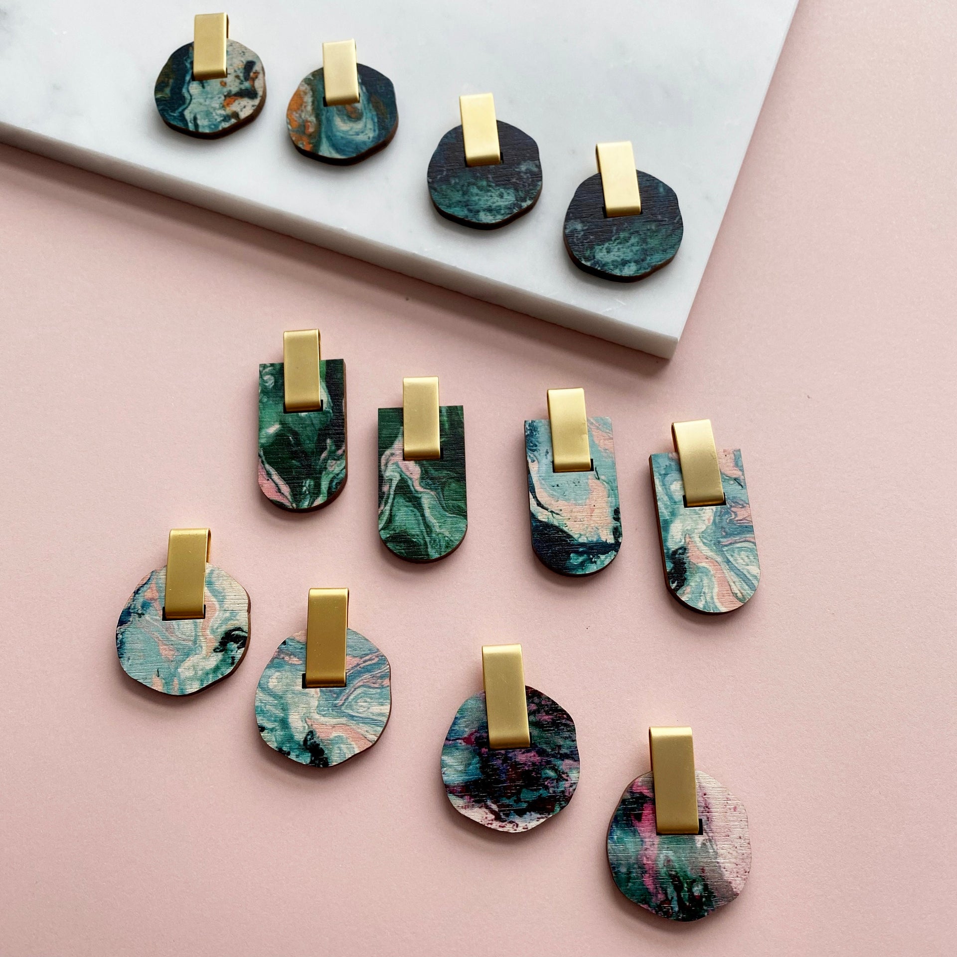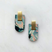 A lovely and simple pair of marbled arc stud earrings, with a matte gold bar detail