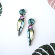 A statement pair of illustrated parrot earrings, featuring my original bird illustration
