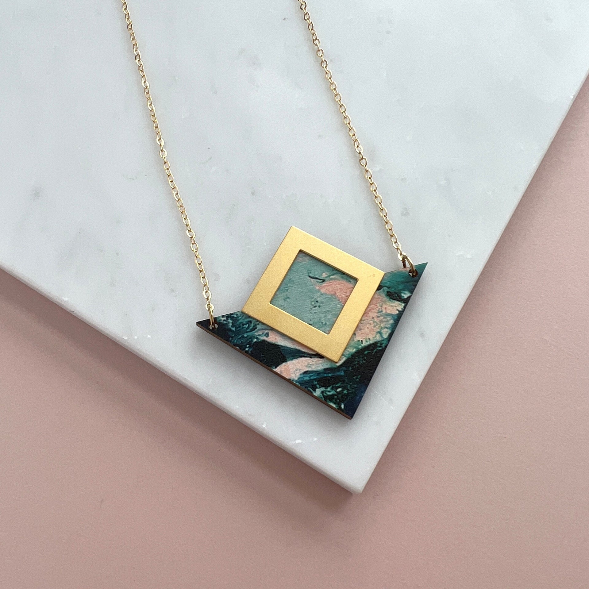 Made from FSC digitally printed ply wood and finished with a lovely matte gold plated geometric shape