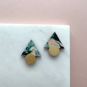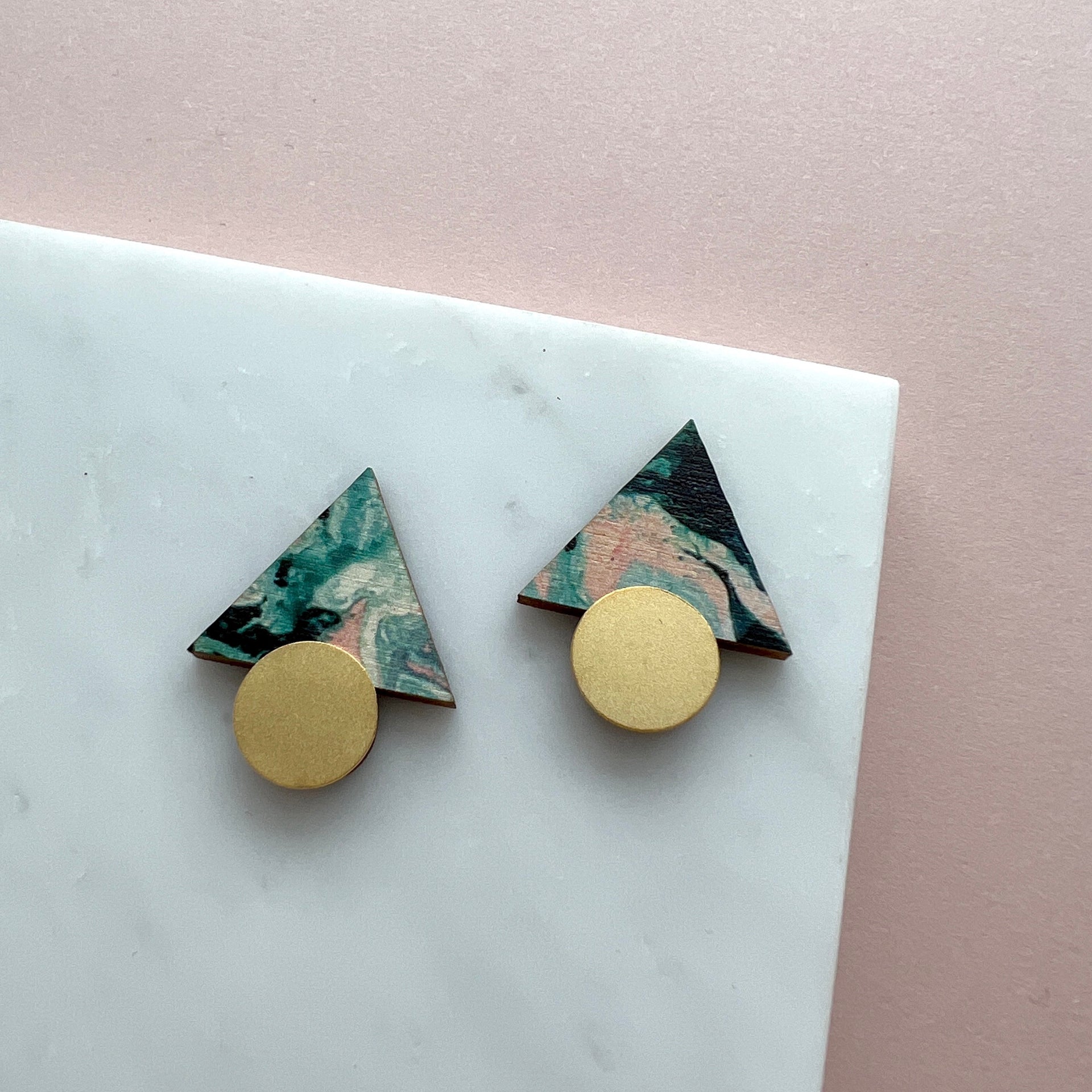 Simple pair of wooden pastel marble triangle stud earrings, with brass circle detailing