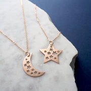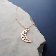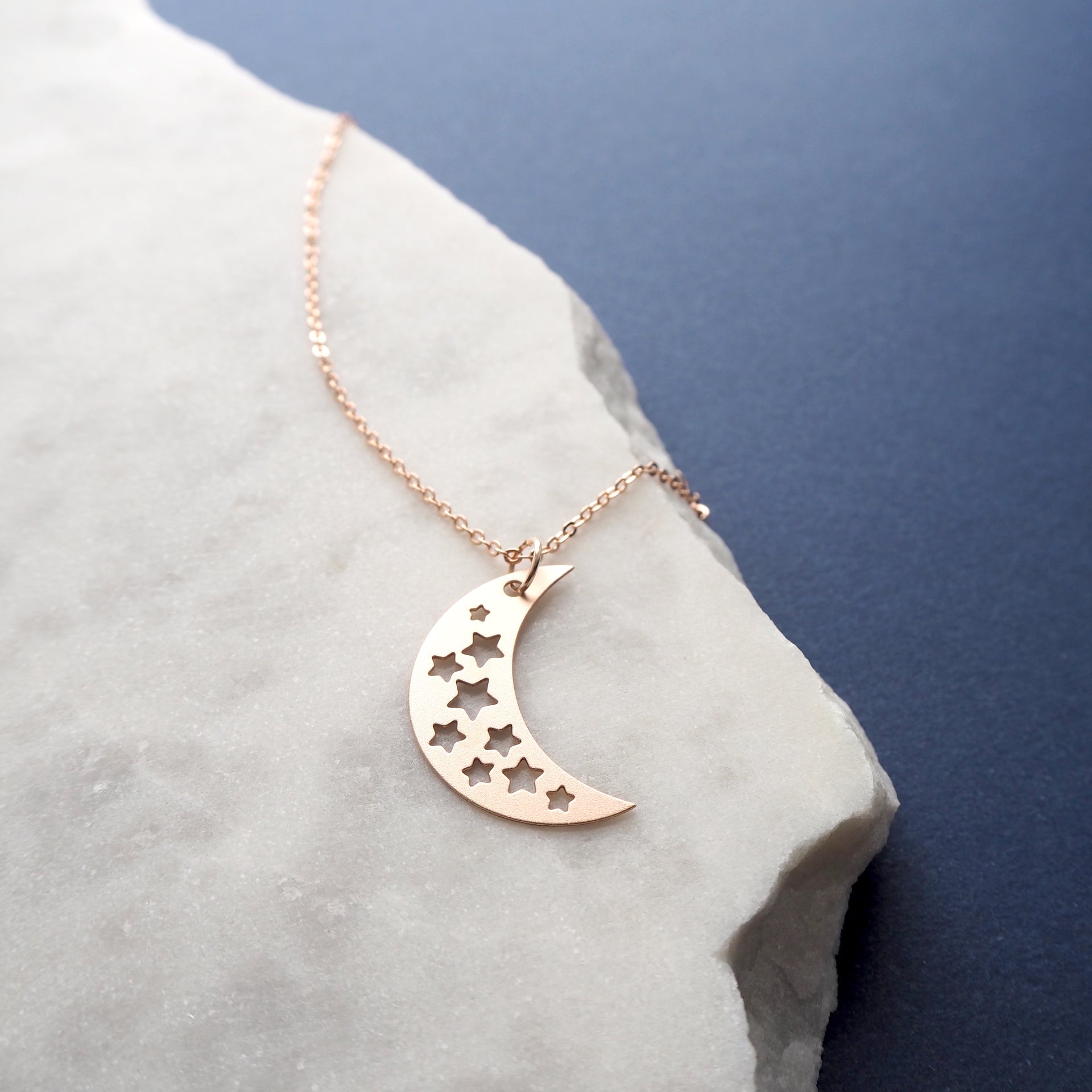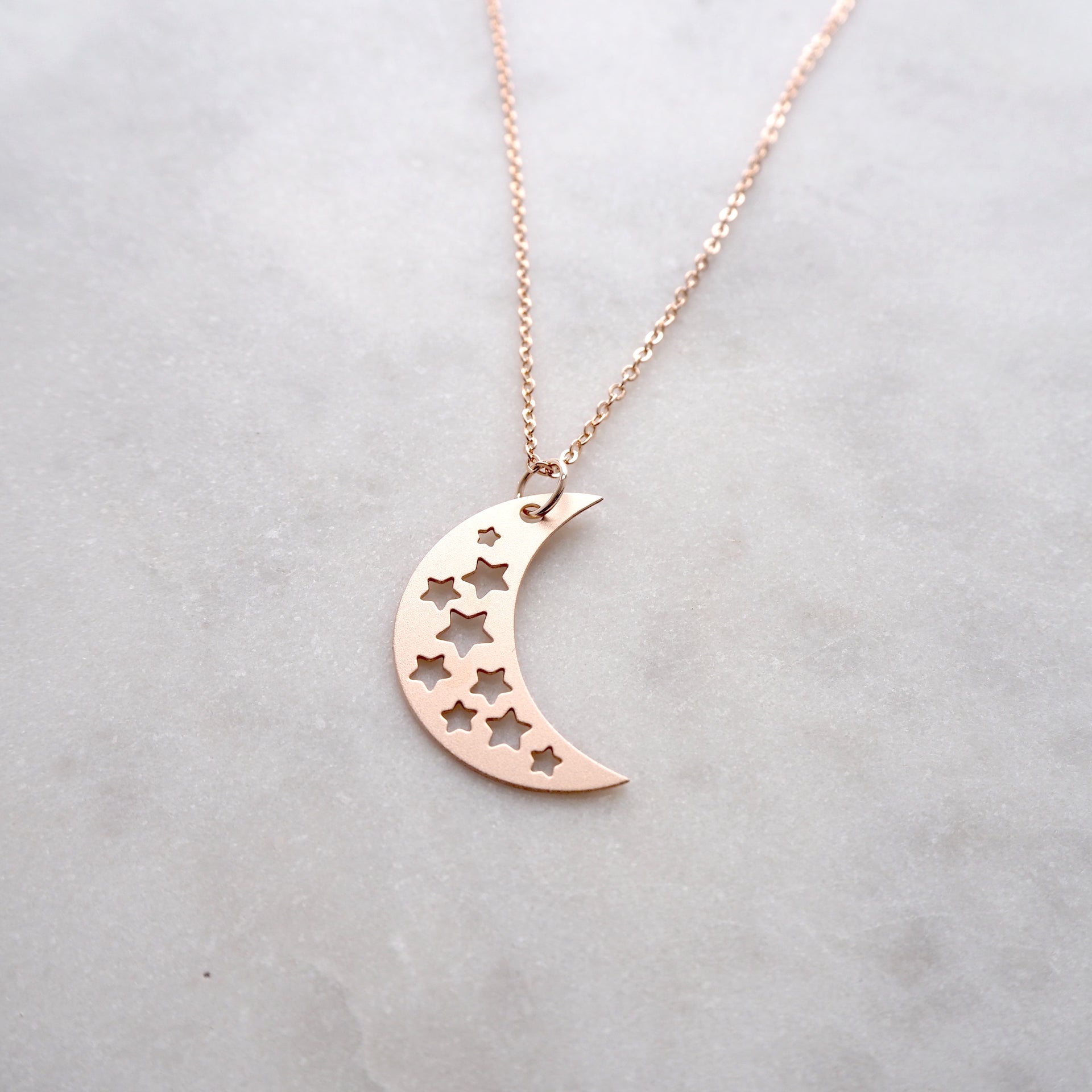 A beautiful rose gold moon necklace with cut out star details, created using my originally illustration