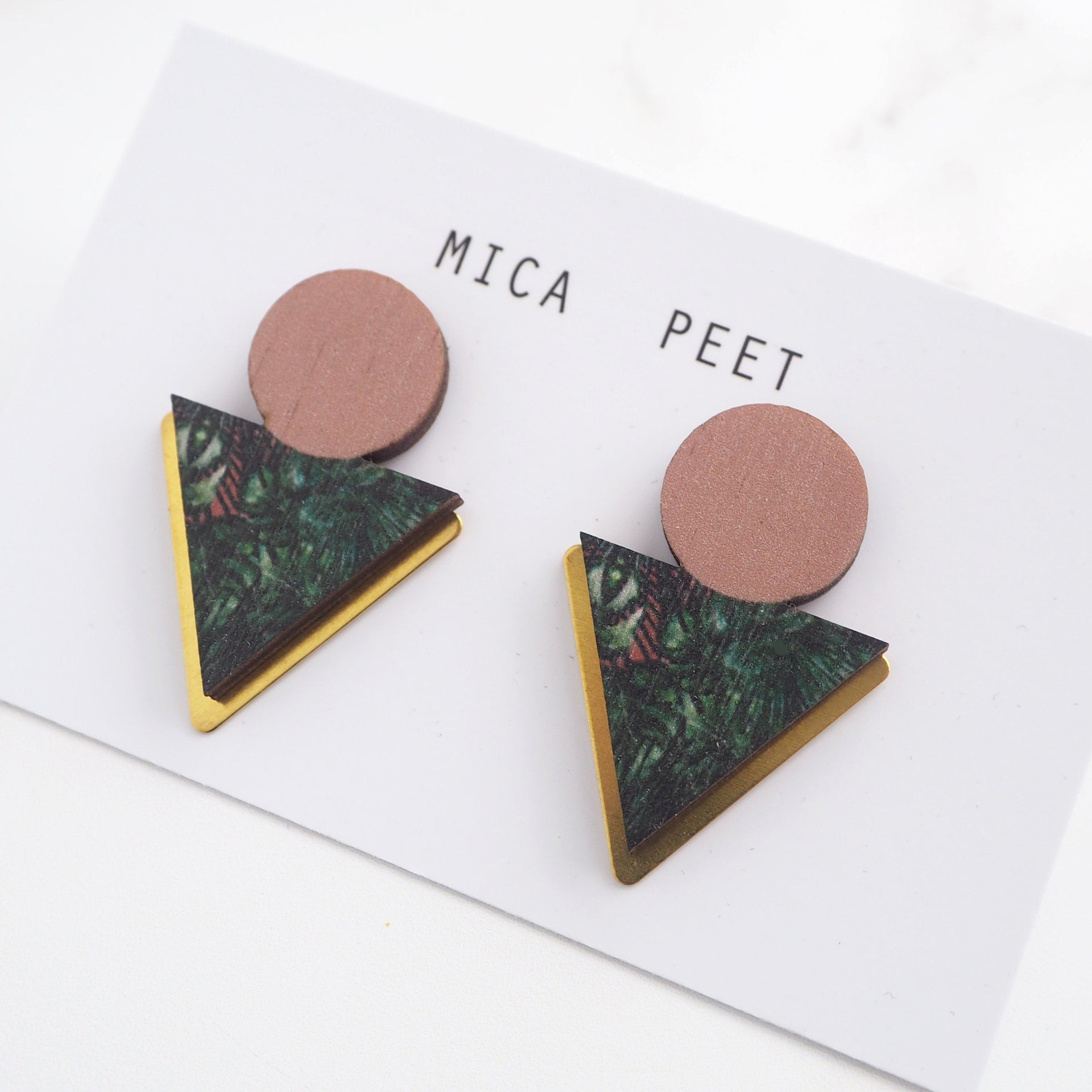 Featuring a pink circle and green triangle which is backed with a larger brass triangle behind