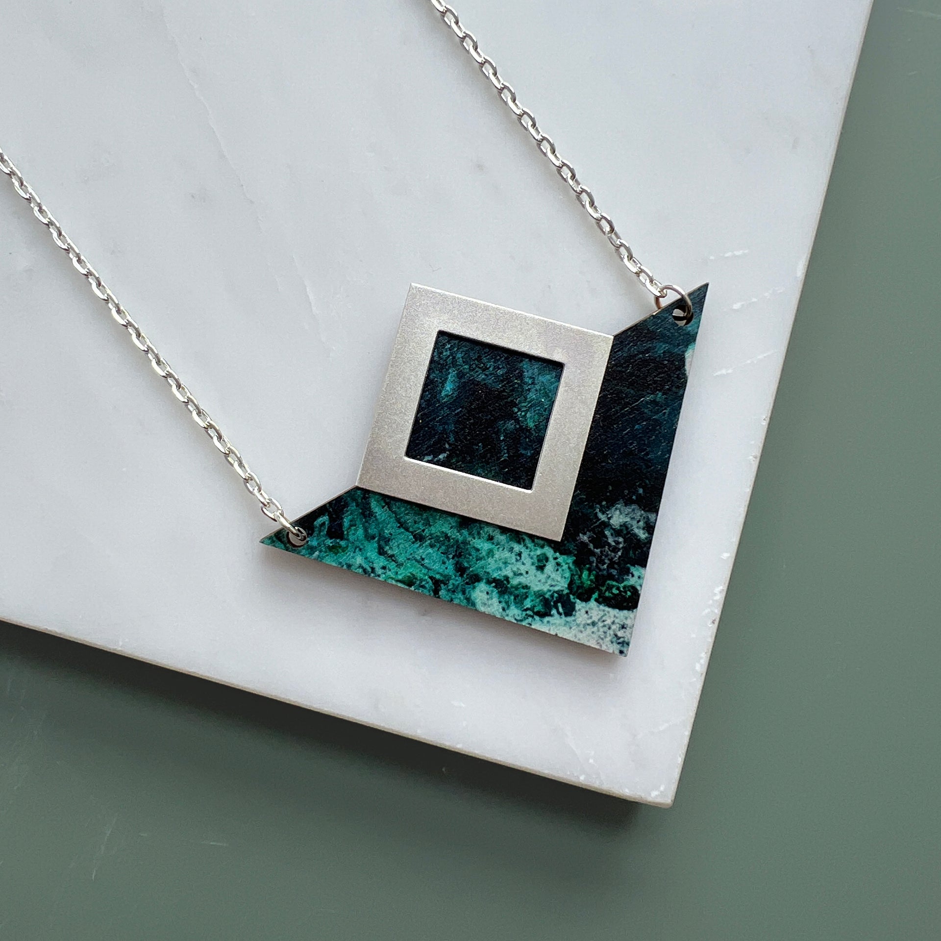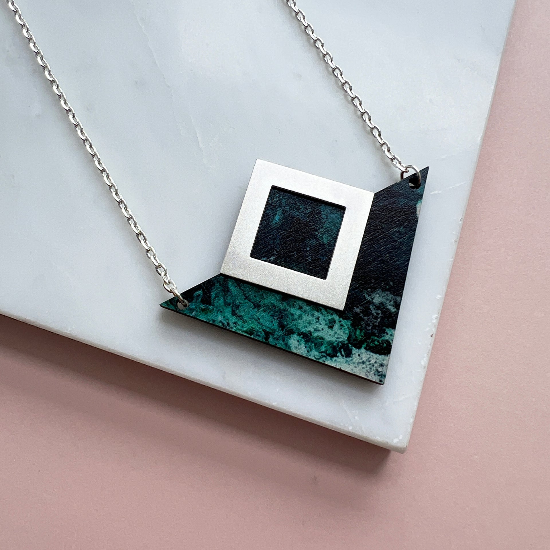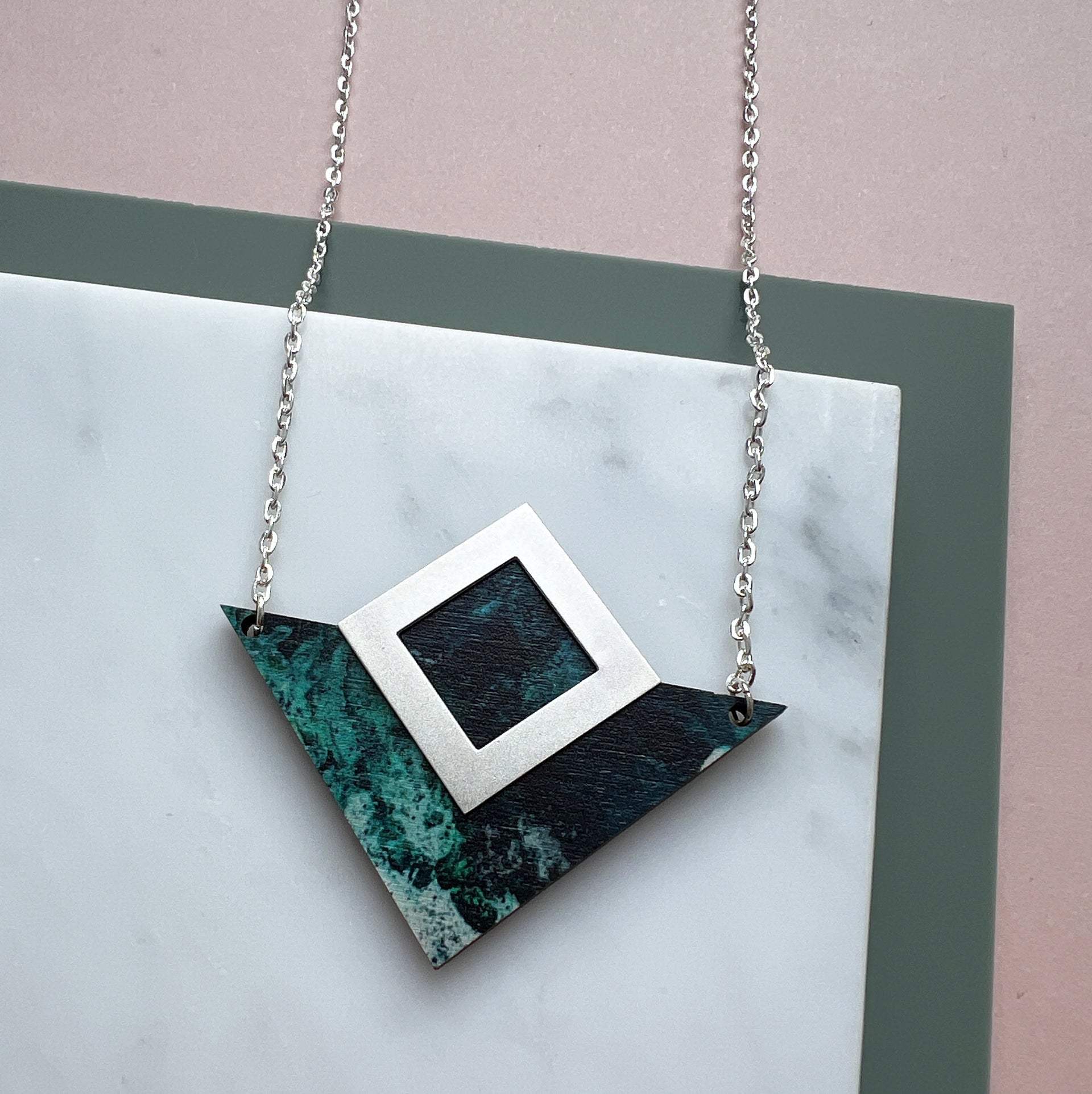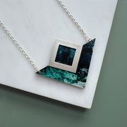 A statement teal & silver plated detail triangle necklace, the perfect gift for geometric jewellery lovers
