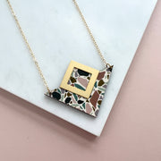 Made from FSC digitally printed ply wood and finished with a lovely matte gold plated geometric shape